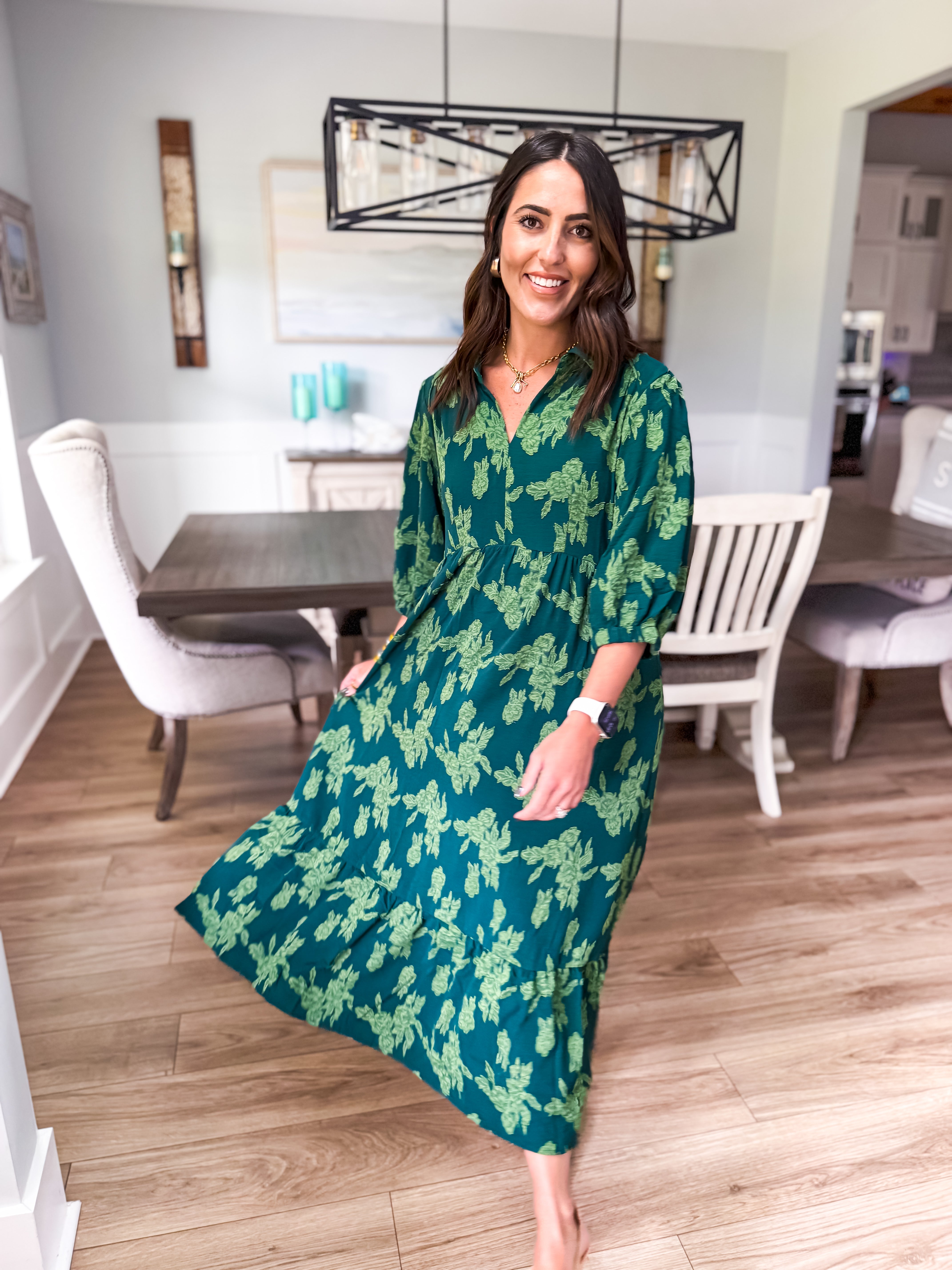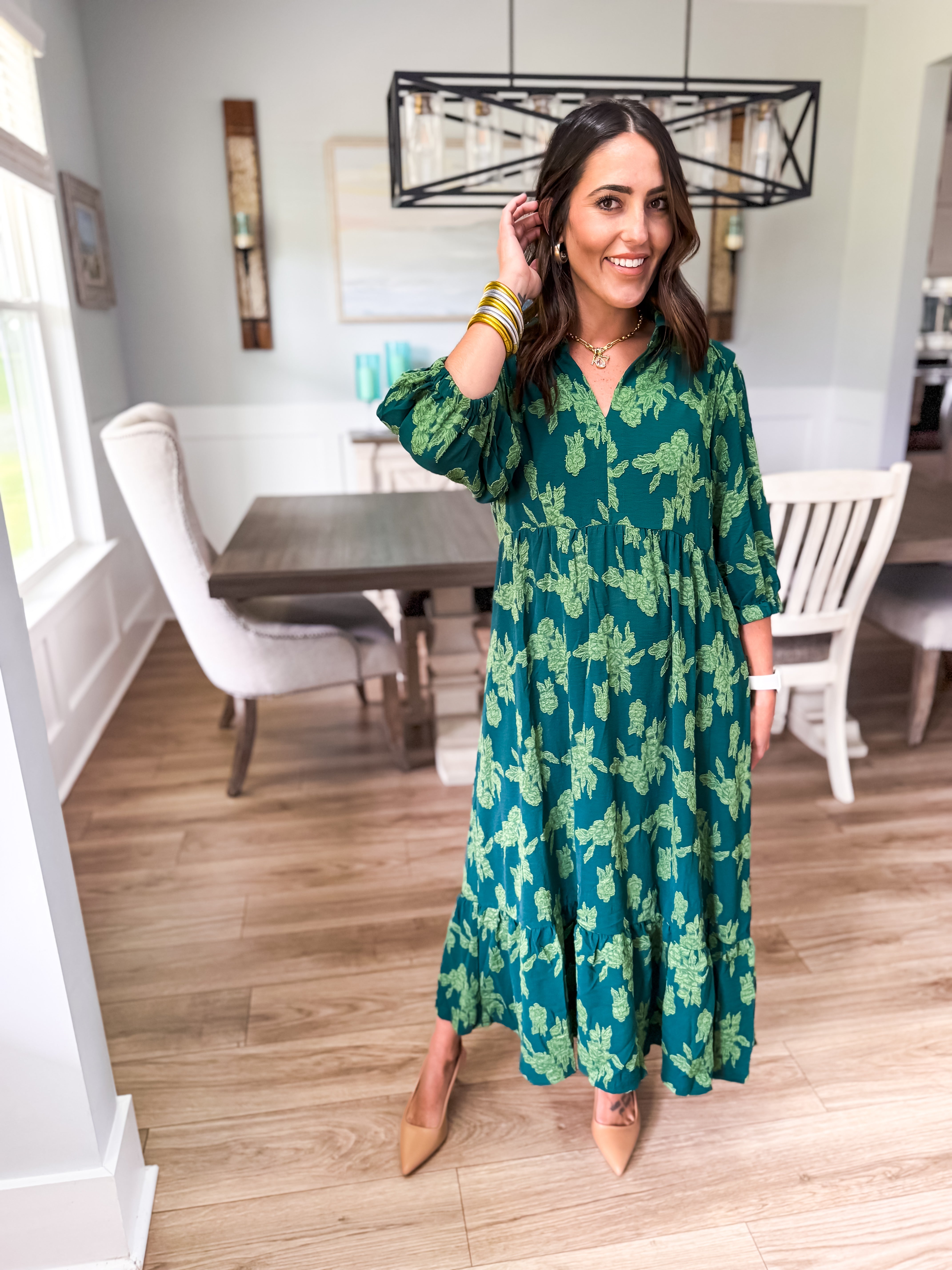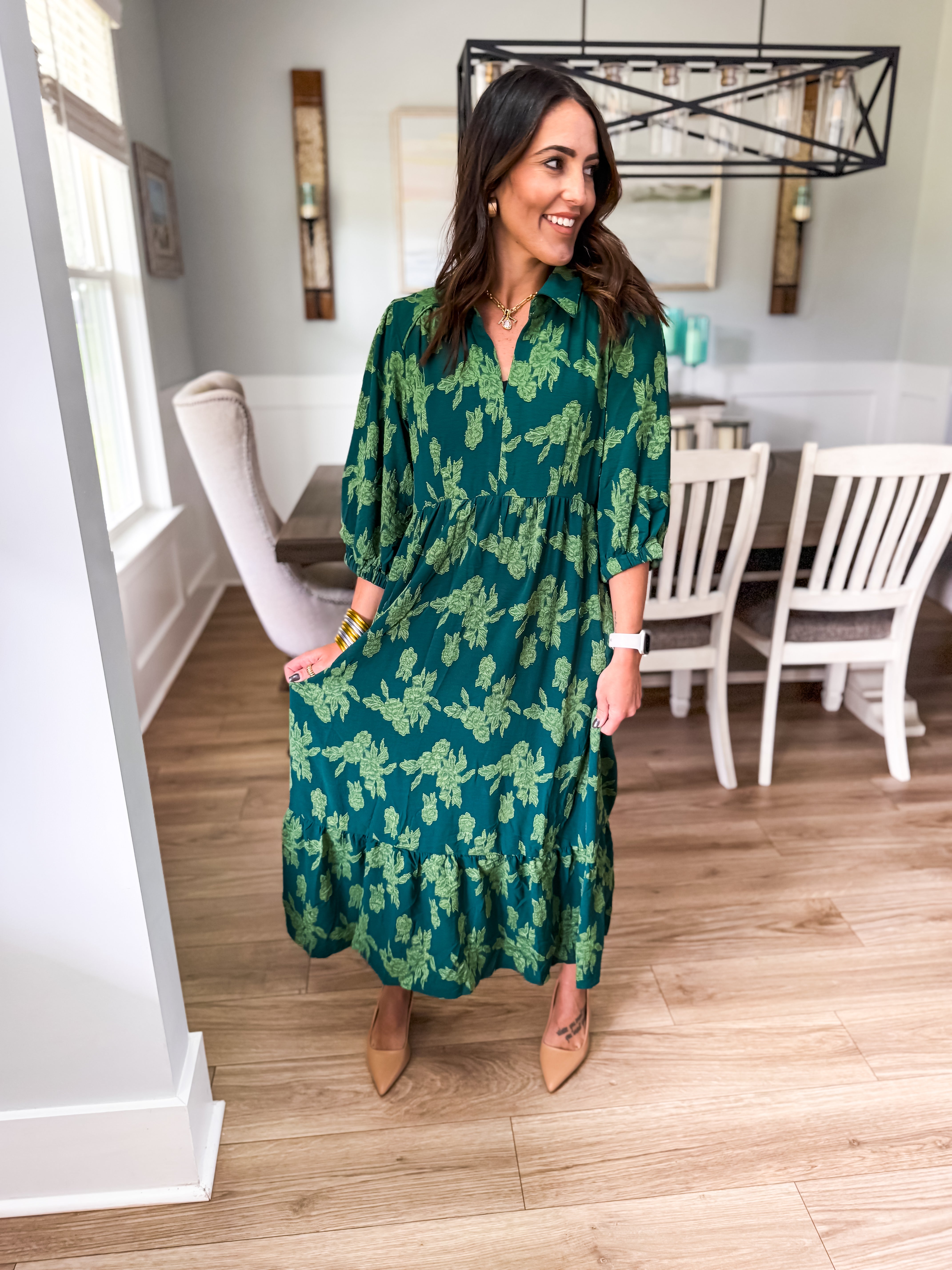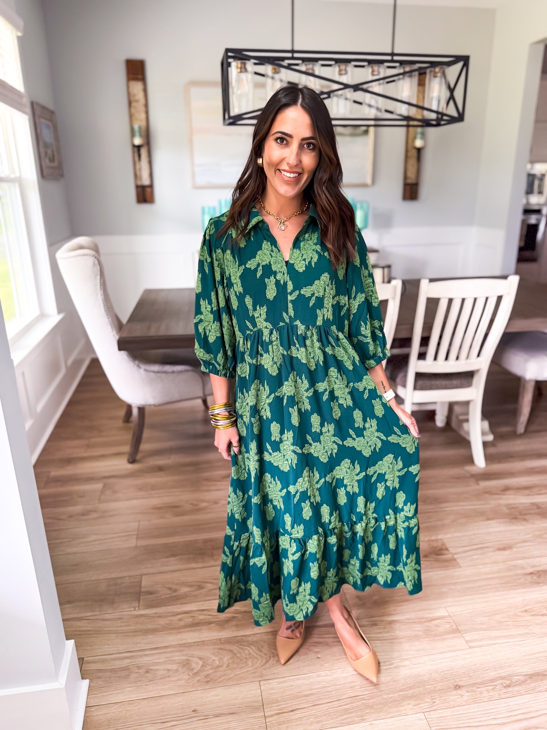 Elevate your wardrobe with our floral burnout midi dress, featuring a chic collared split neck, 3/4 sleeves, and tiered design. Piping details add the perfect finishing touch for a look that's effortlessly elegant!