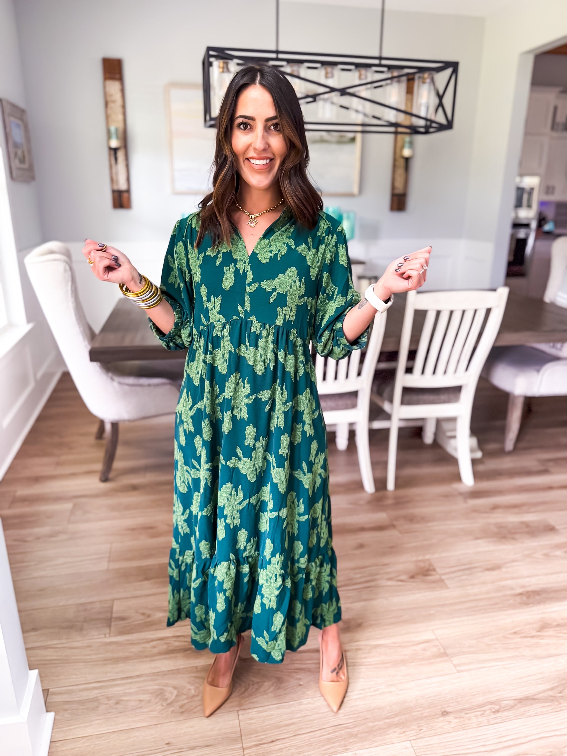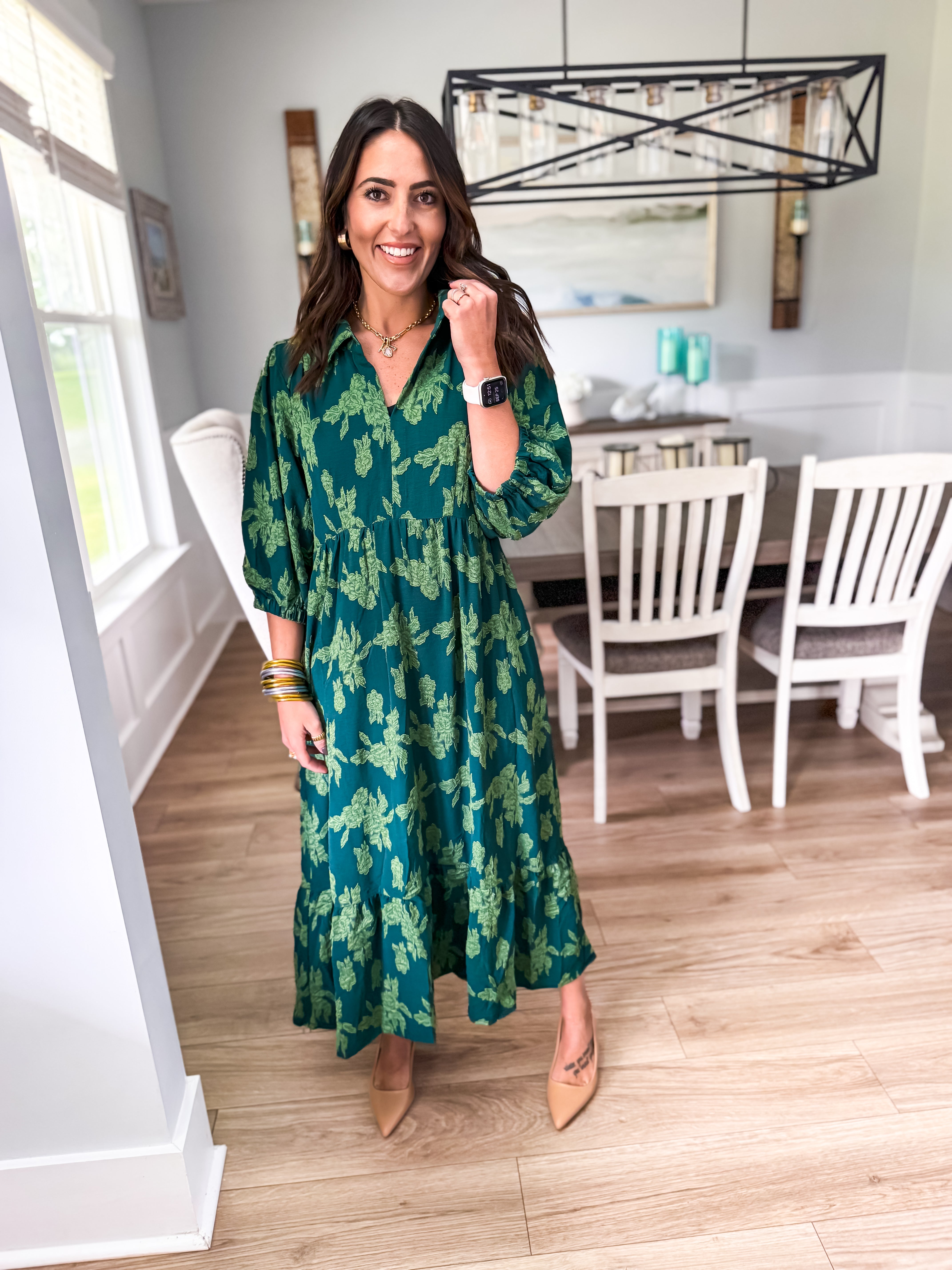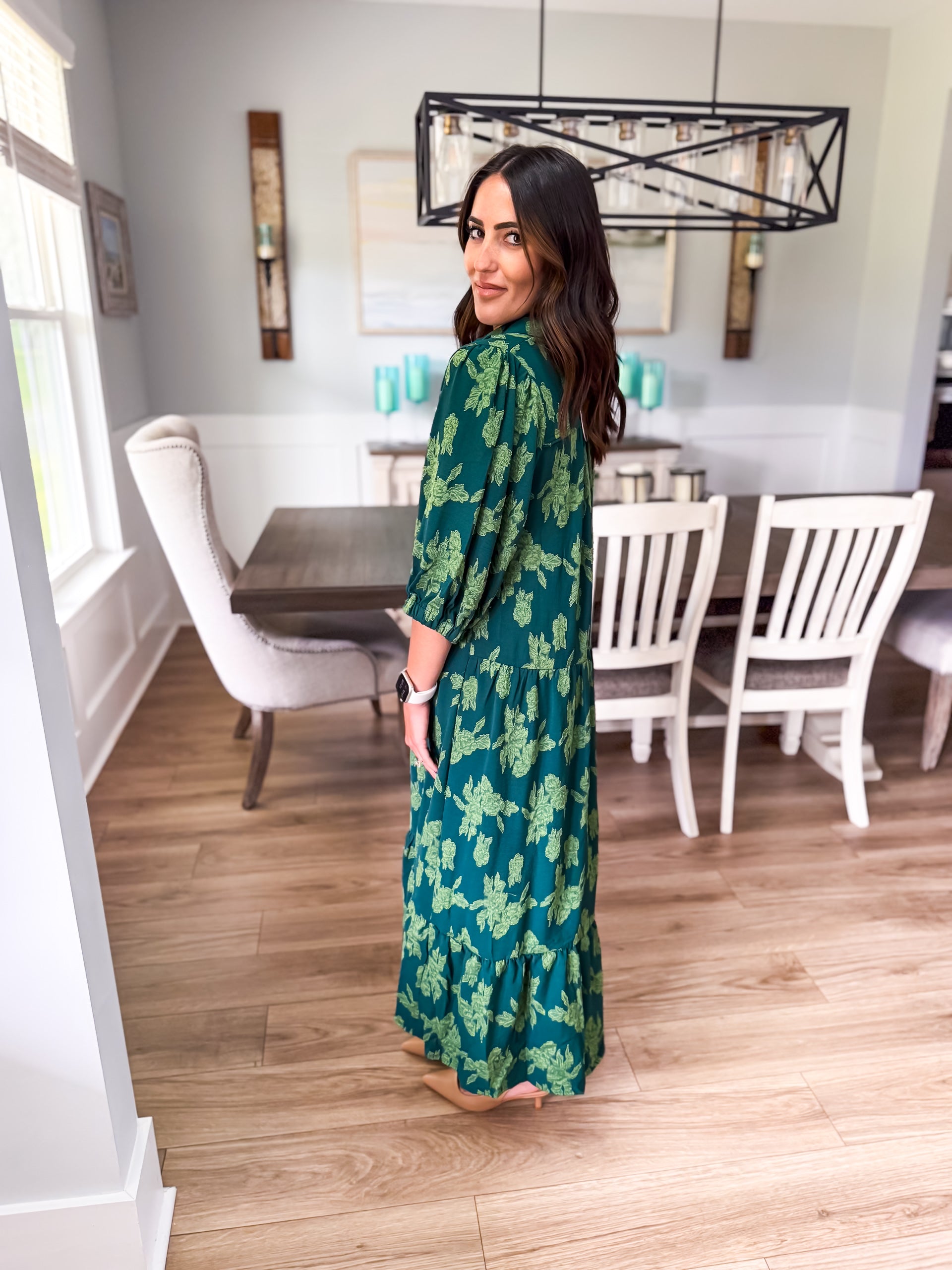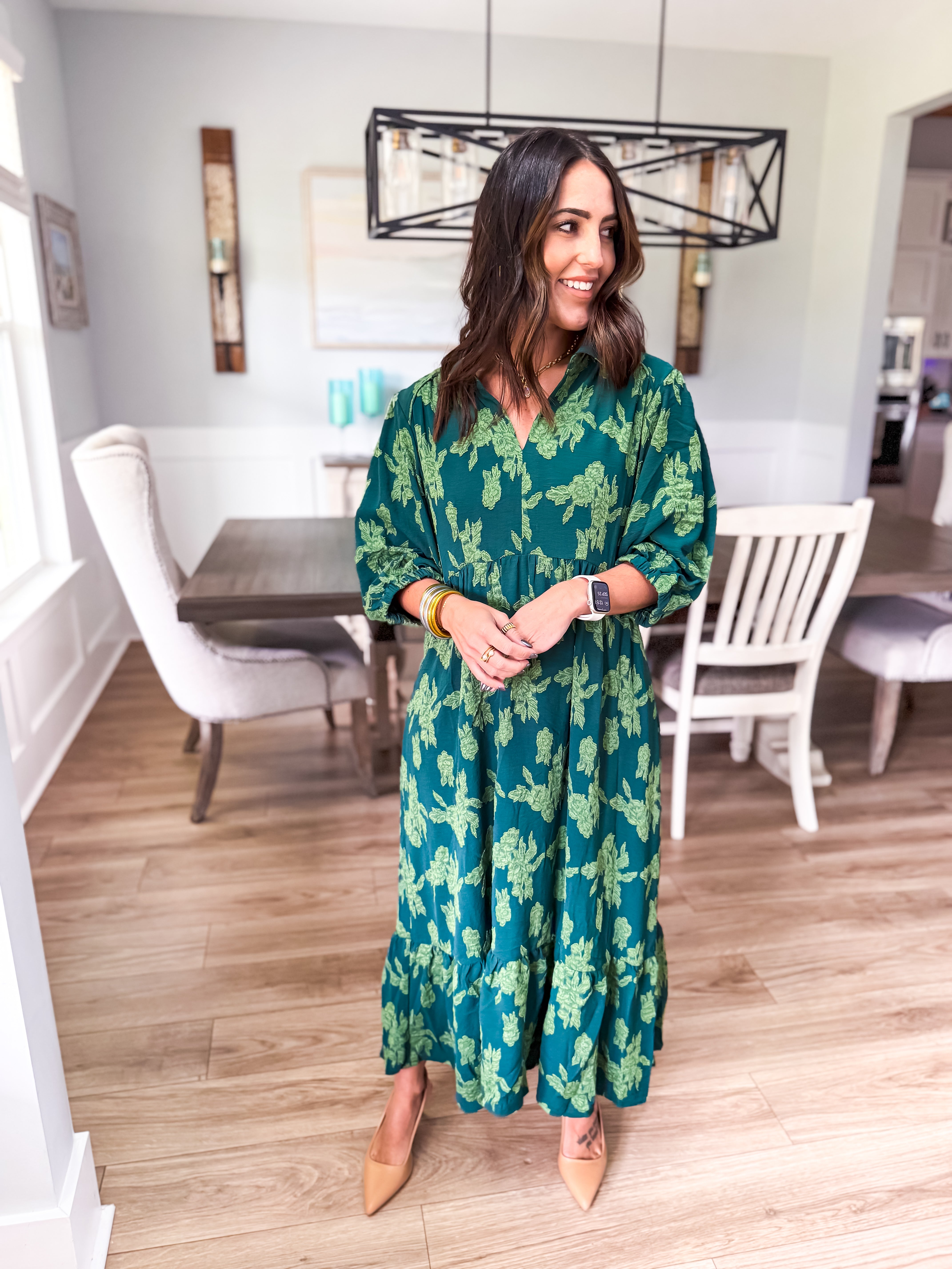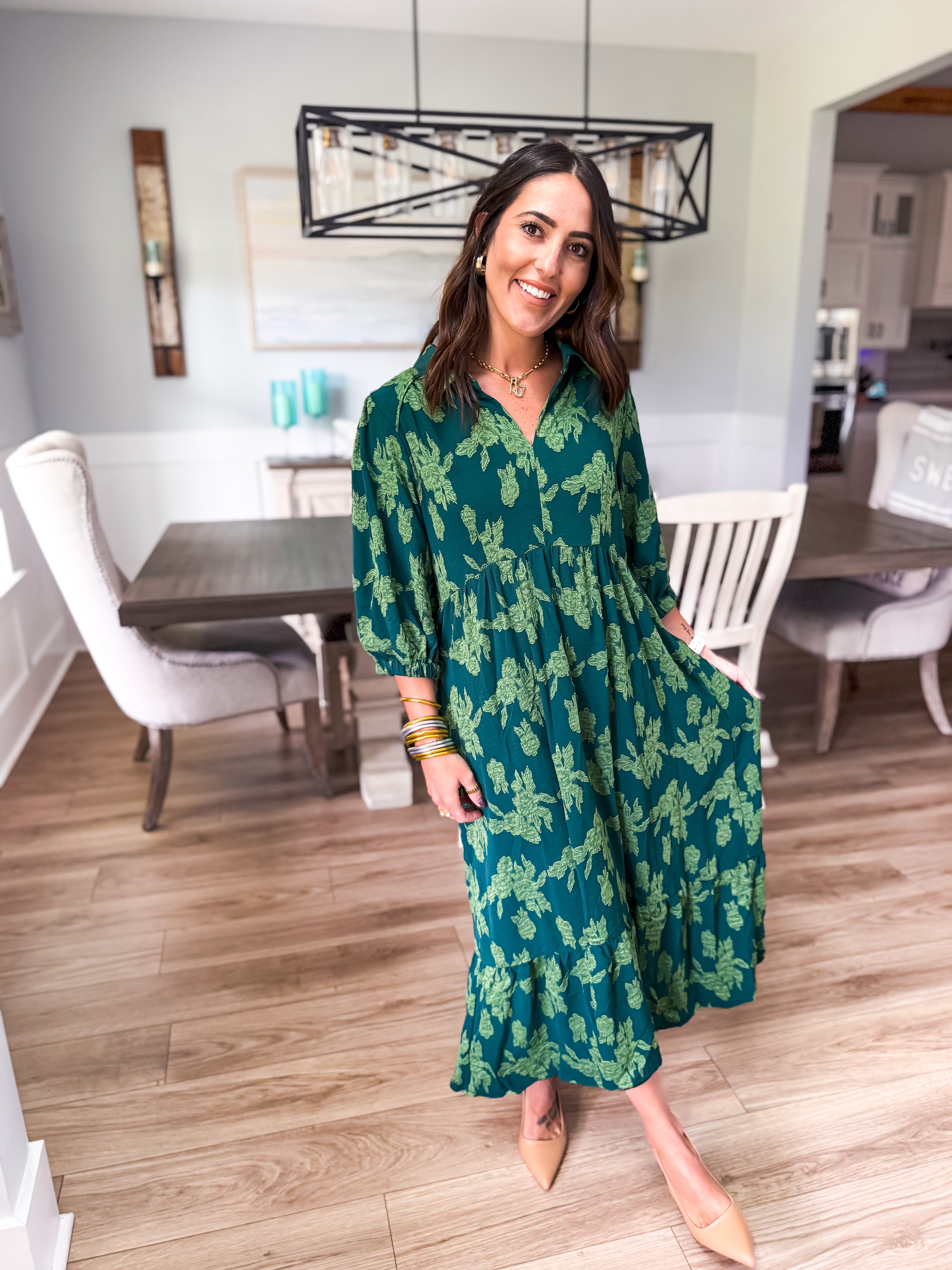 Elevate your wardrobe with our floral burnout midi dress, featuring a chic collared split neck, 3/4 sleeves, and tiered design. Piping details add the perfect finishing touch for a look that's effortlessly elegant!