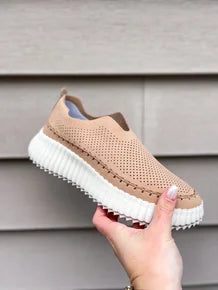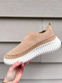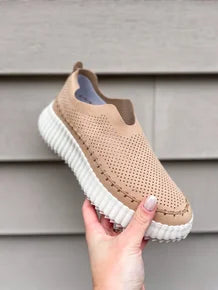 Tan suede slip on shoe. this is such a casual shoe to dress up or down any outfit and has the cutest platform detail for a more elevated look.