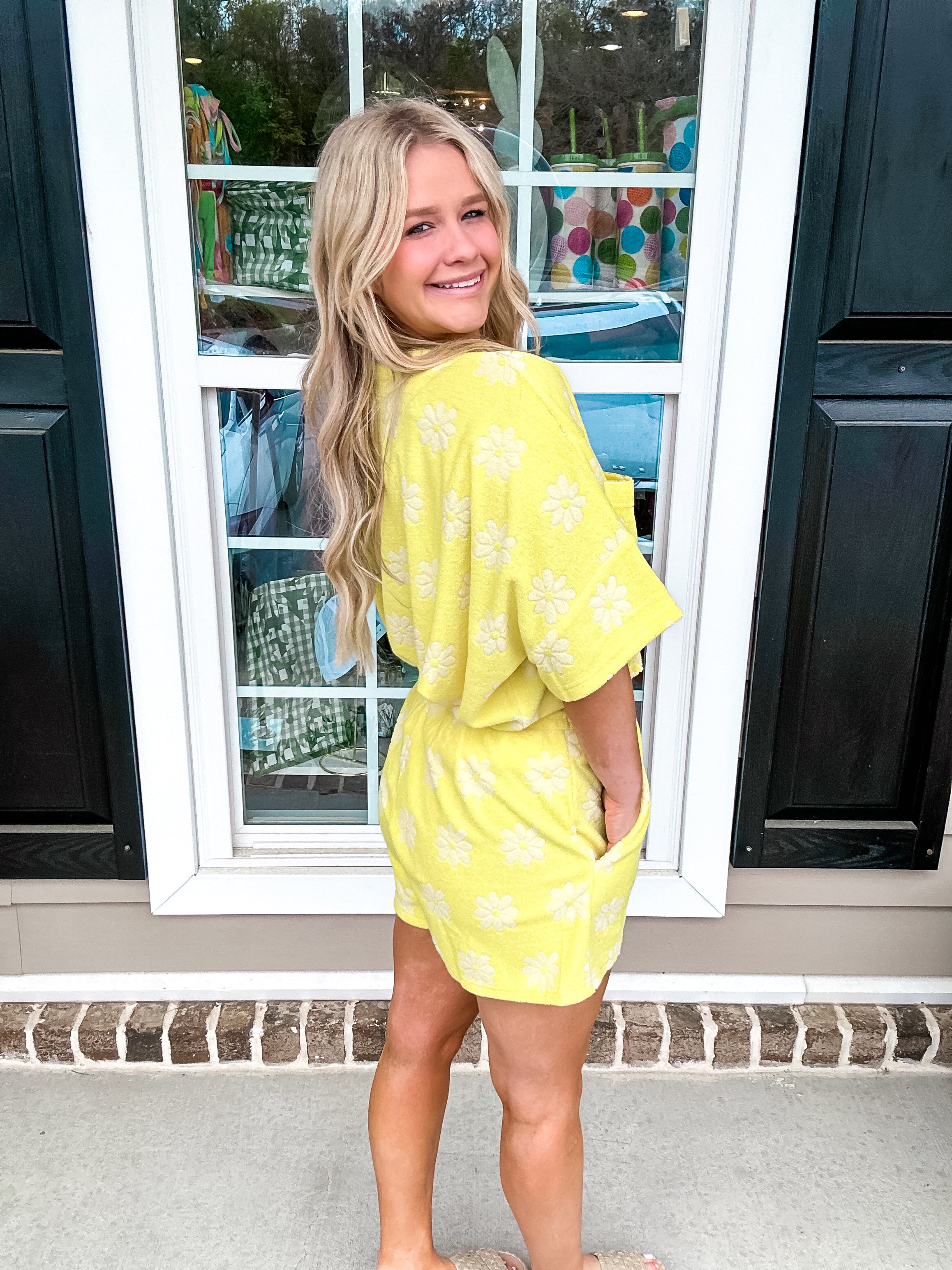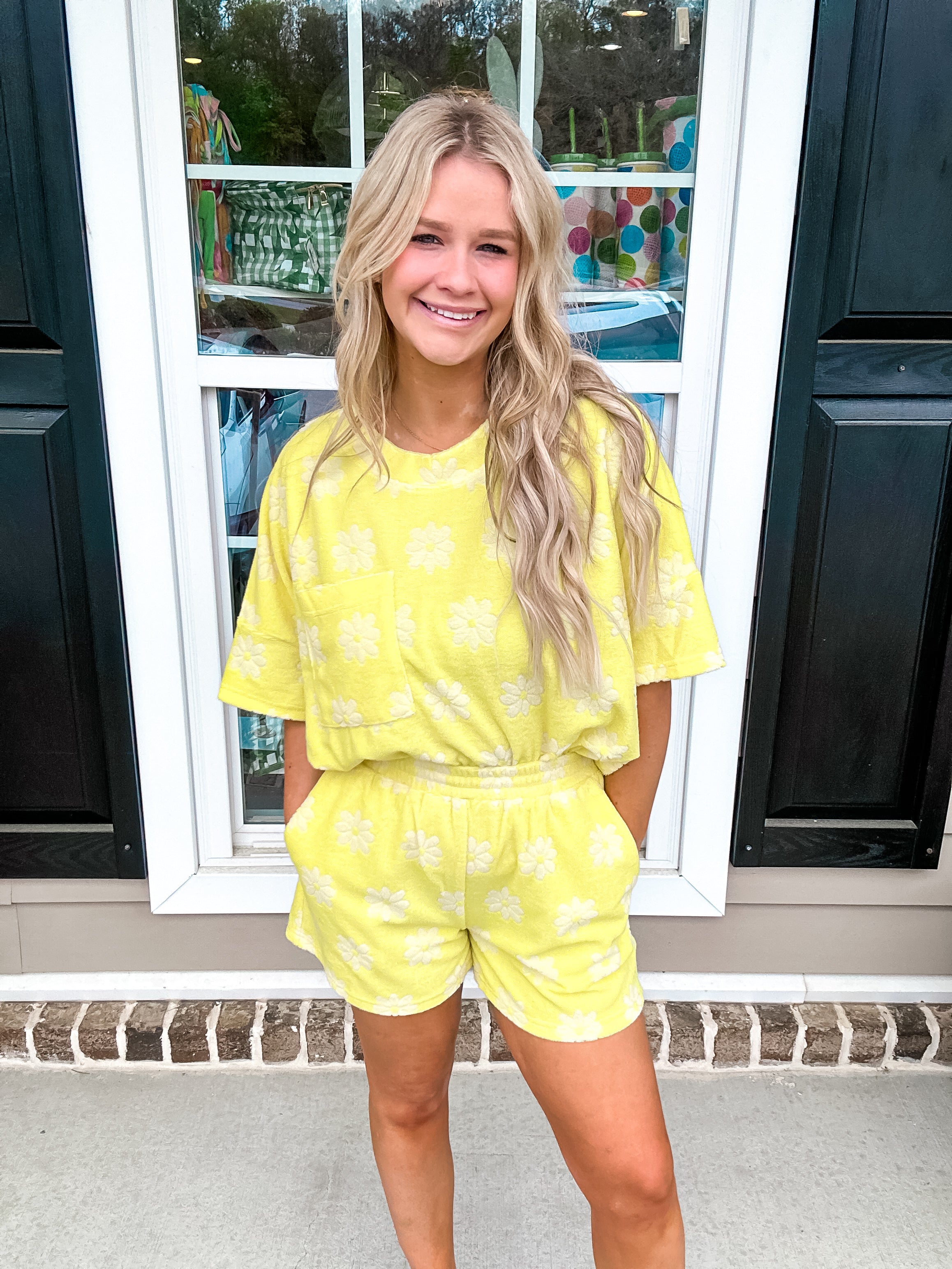 Floral print terry cloth high waisted shorts featuring pocket at sides. Elastic at waist. Unlined. Knit. Non-sheer. Lightweight.