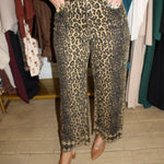 Leopard pattern pants featuring floral embroidered hem. Button zip-fly front closure with classic denim pockets. Unlined. Woven. Non-sheer. Lightweight.