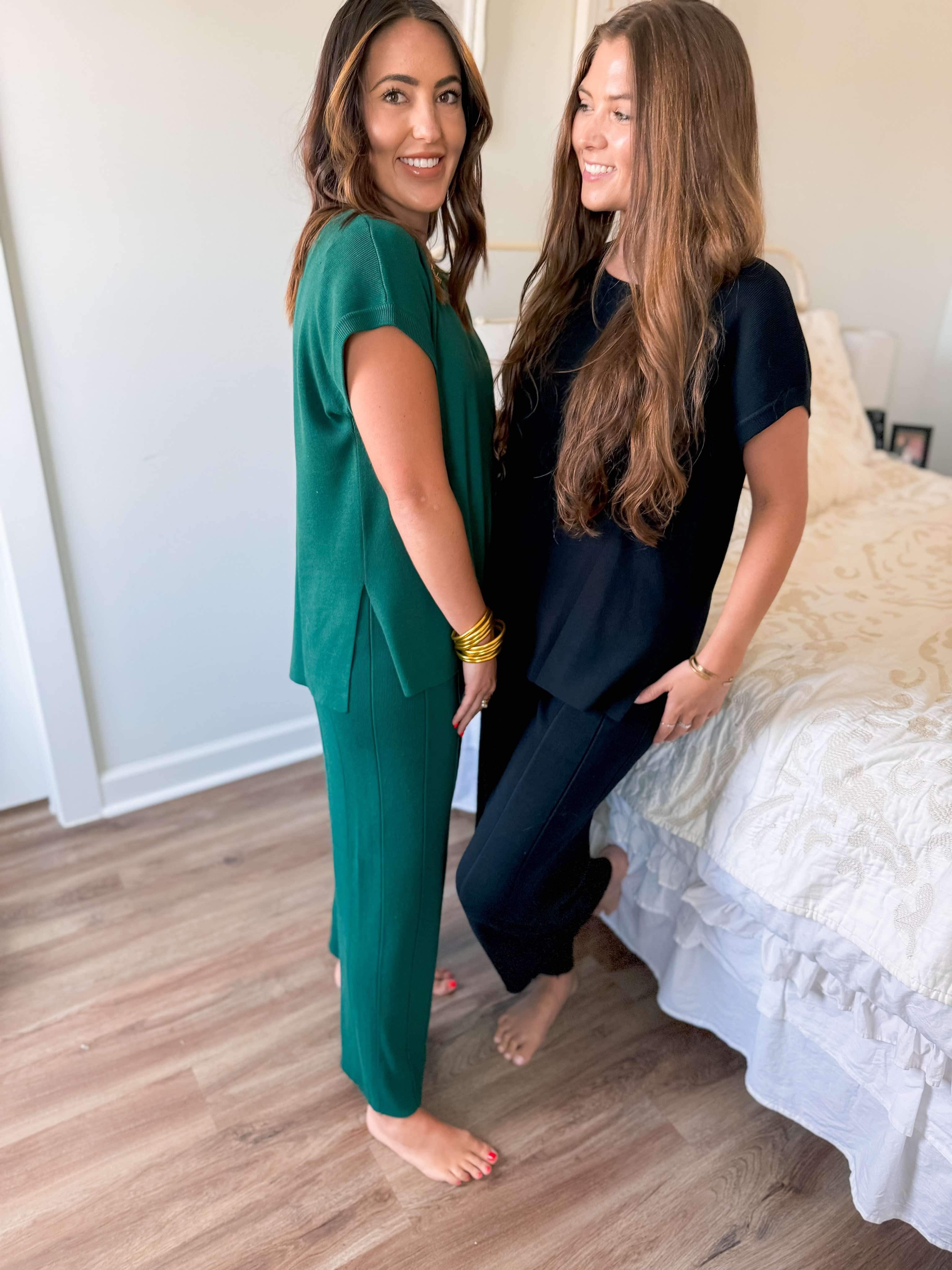 Solid ribbed round neck short sleeve top featuring slit at sides. Unlined. Knit. Non-sheer. Lightweight.