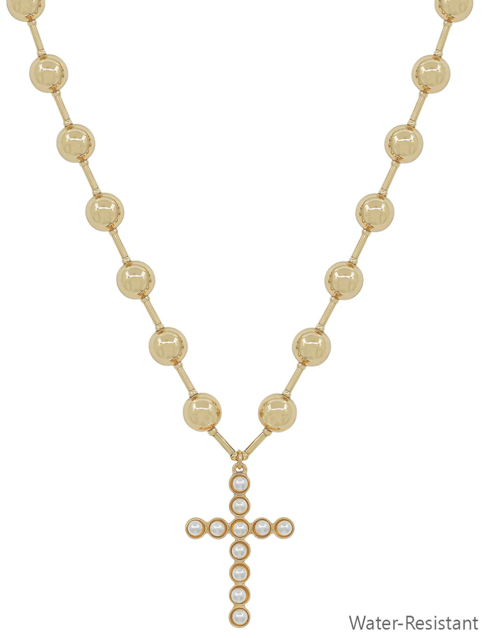 Water Resistant 8MM Beaded Chain + Pearl Beaded Cross Necklace - Final Sale