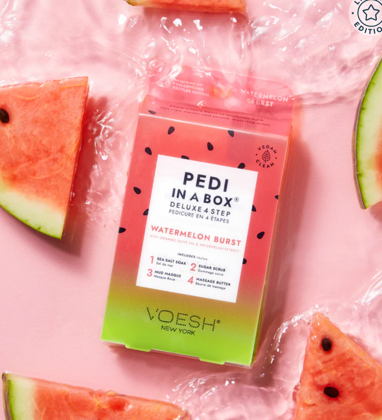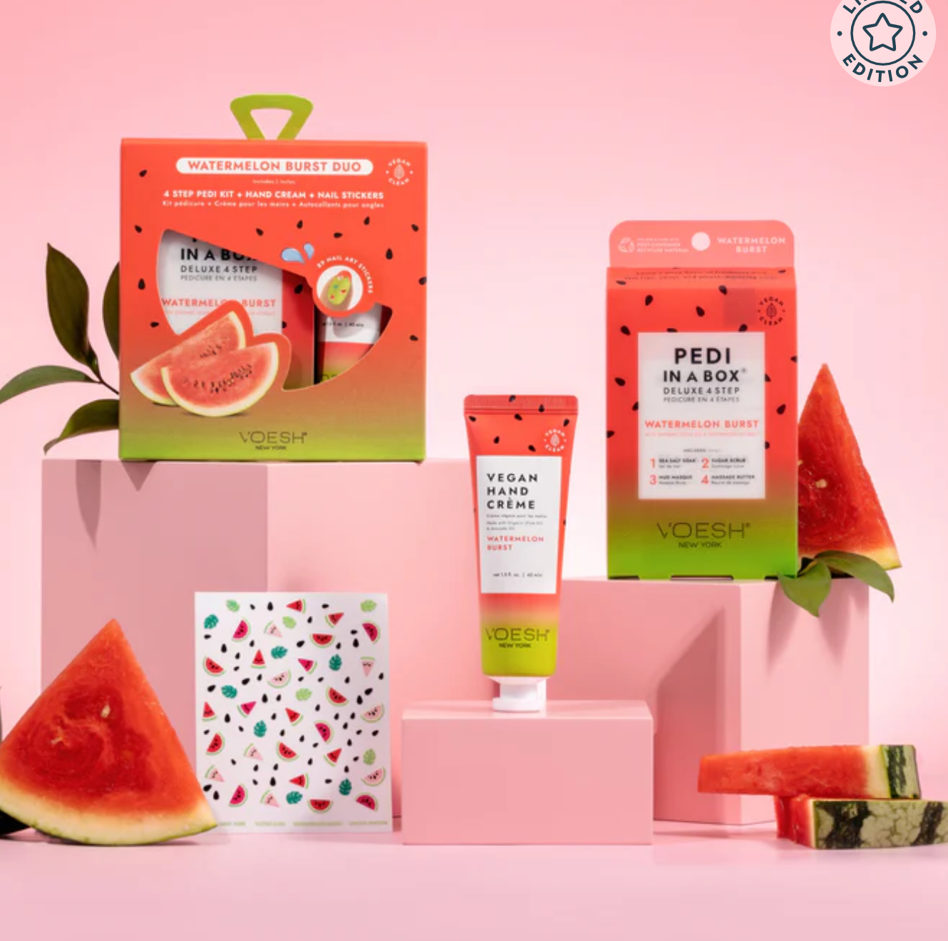 Splash into summer with our Watermelon Burst Duo, featuring our juicy, watermelon-inspired scent! Our Watermelon Burst Duo includes our Pedi in a Box Deluxe 4 Step Watermelon Burst, matching Vegan Hand & Body Crème, and Watermelon Nail Stickers that will leave you feeling fresh and fruity all season long.