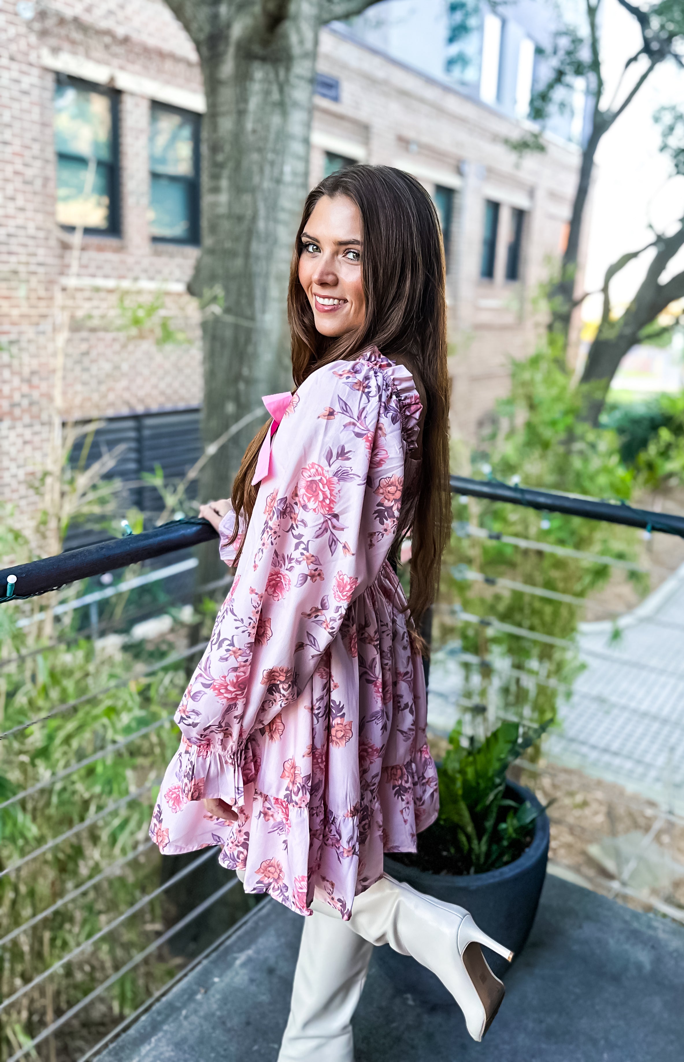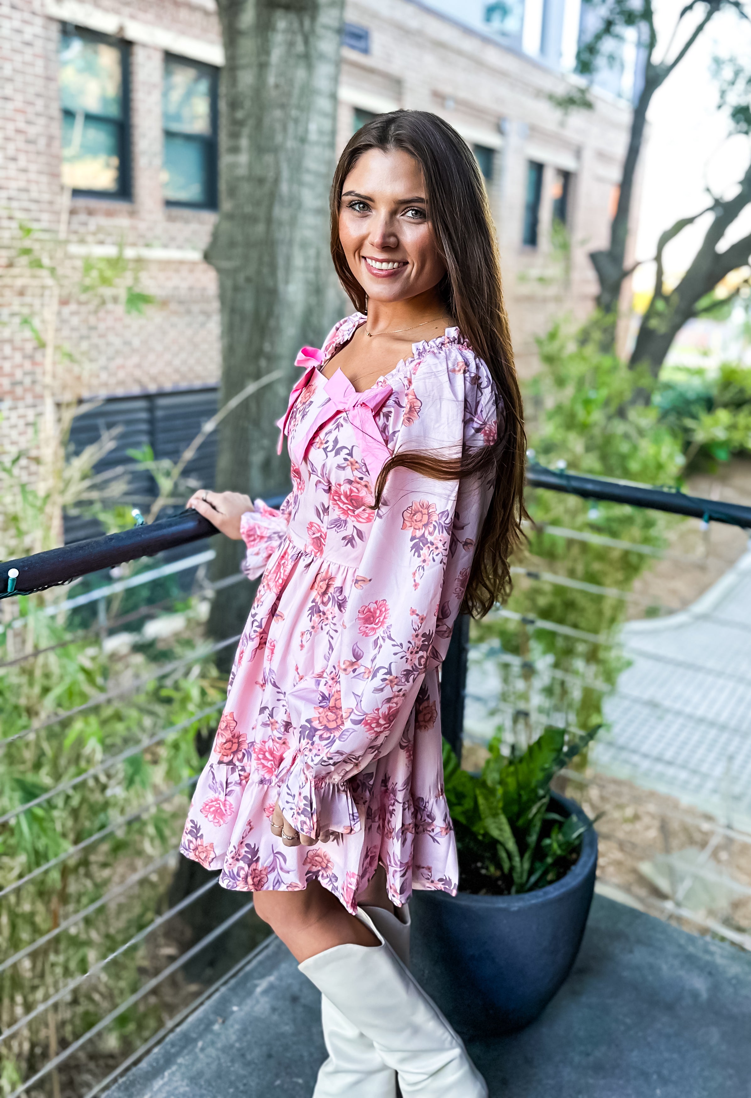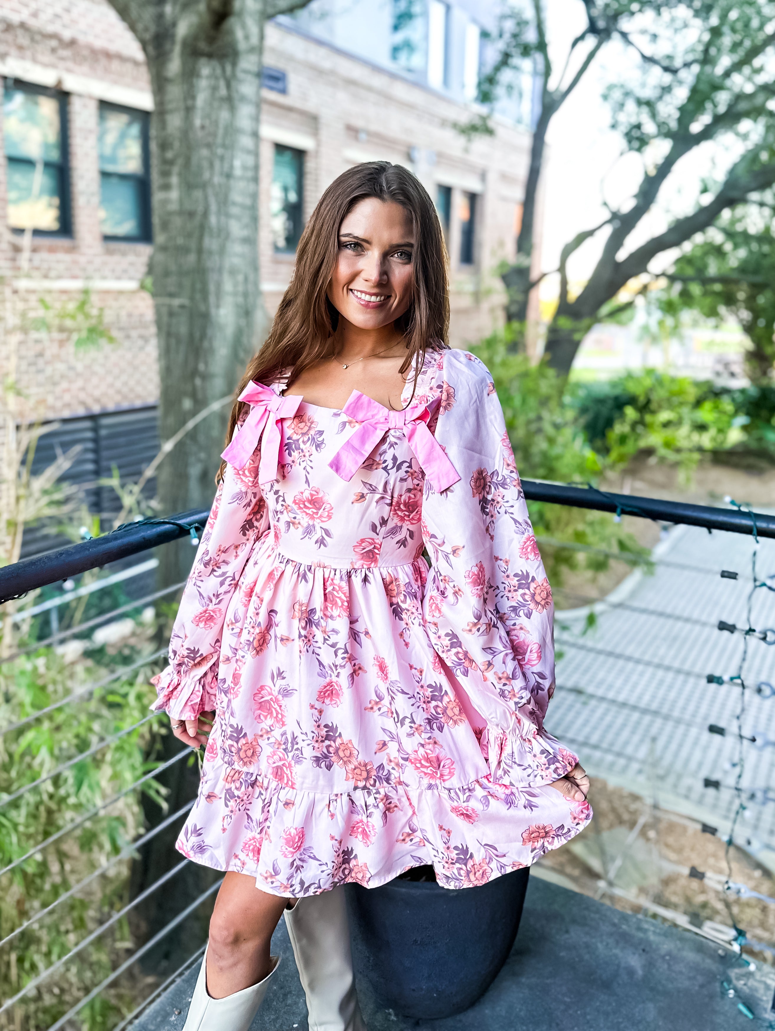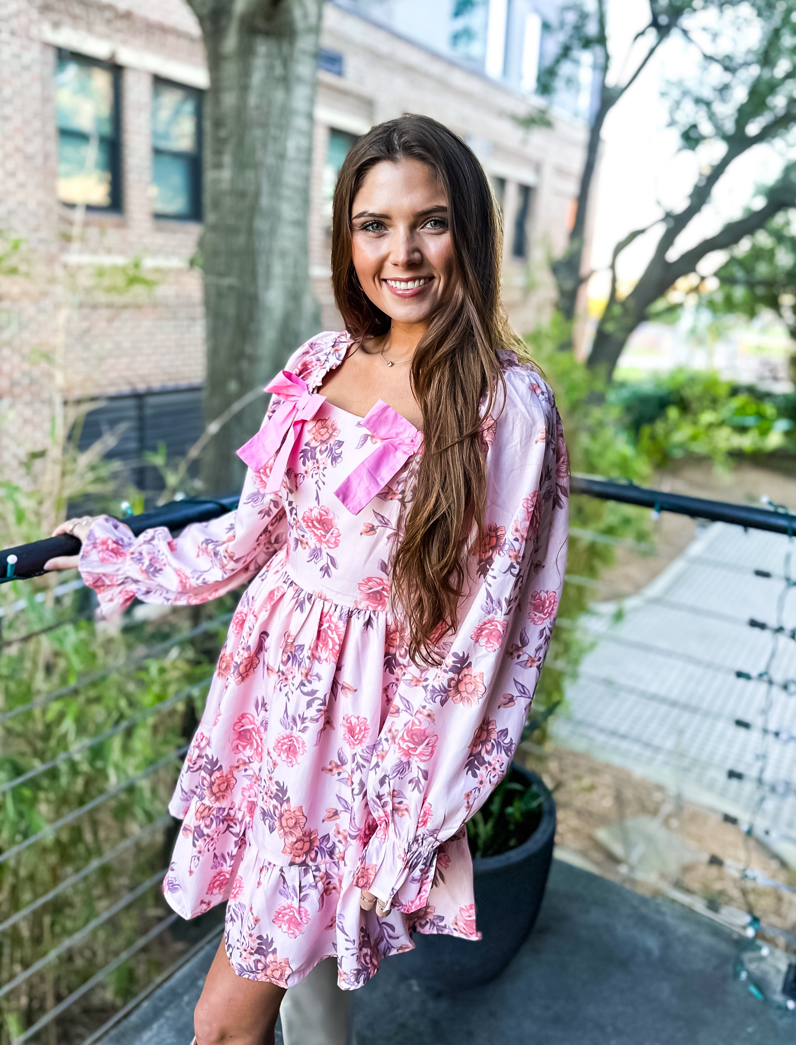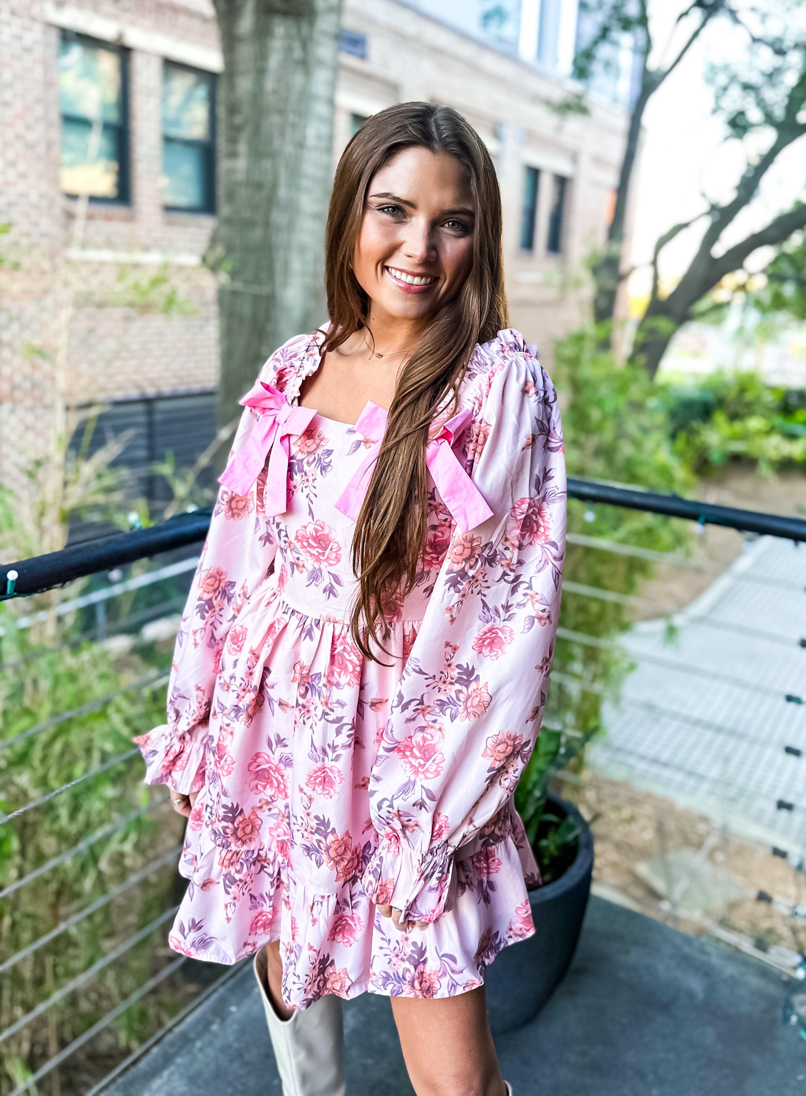 Long sleeve mini dress with ribbon bow details at the neckline of the dress. It features an elastic sleeve at the shoulder and around the neckline for extra comfort. It does feature a zipper down the center of the back of the dress for easy on and off. It does have smocking around the bust for extra comfort. It is lined as well - for extra coverage.