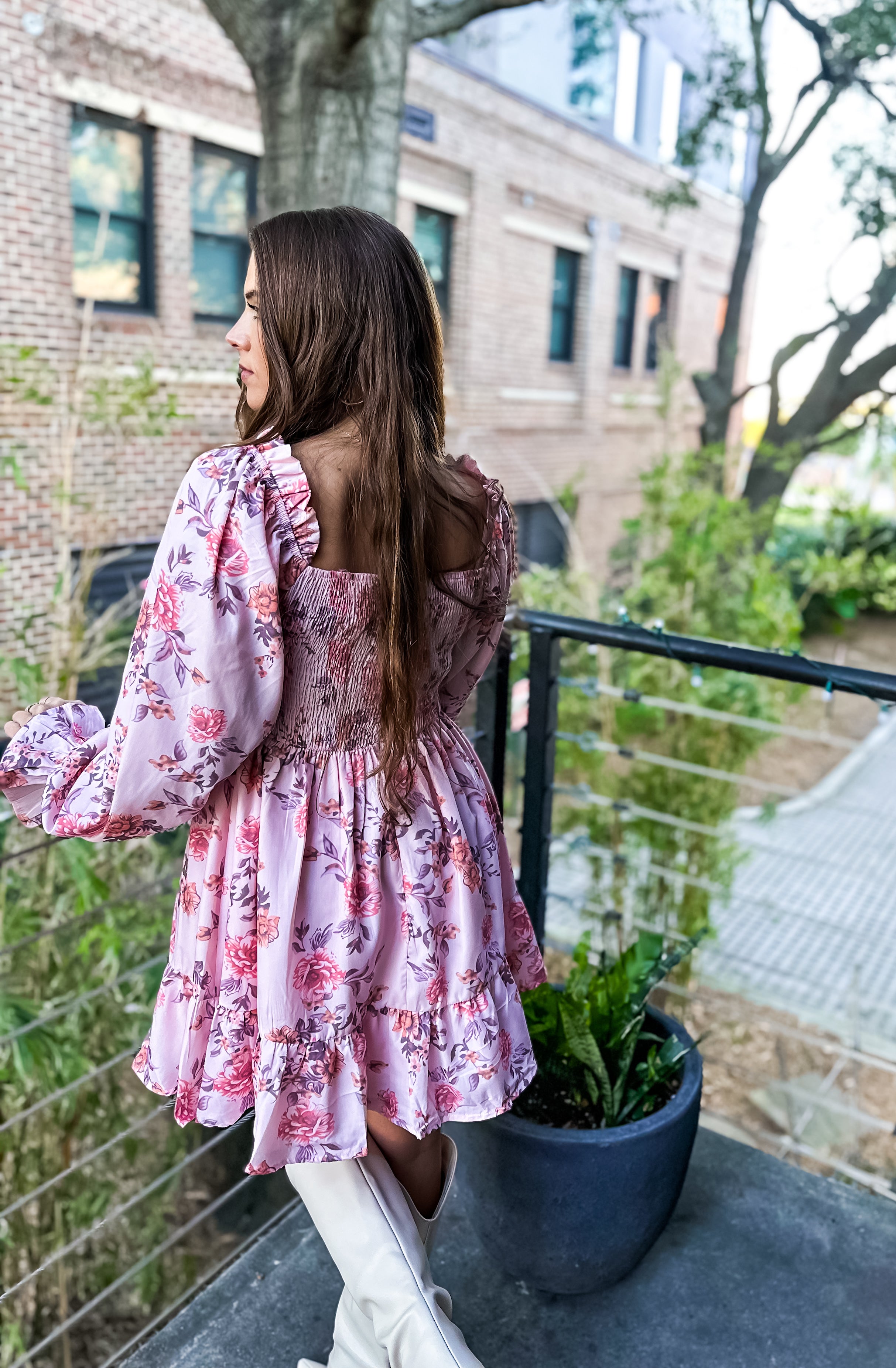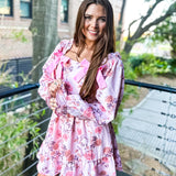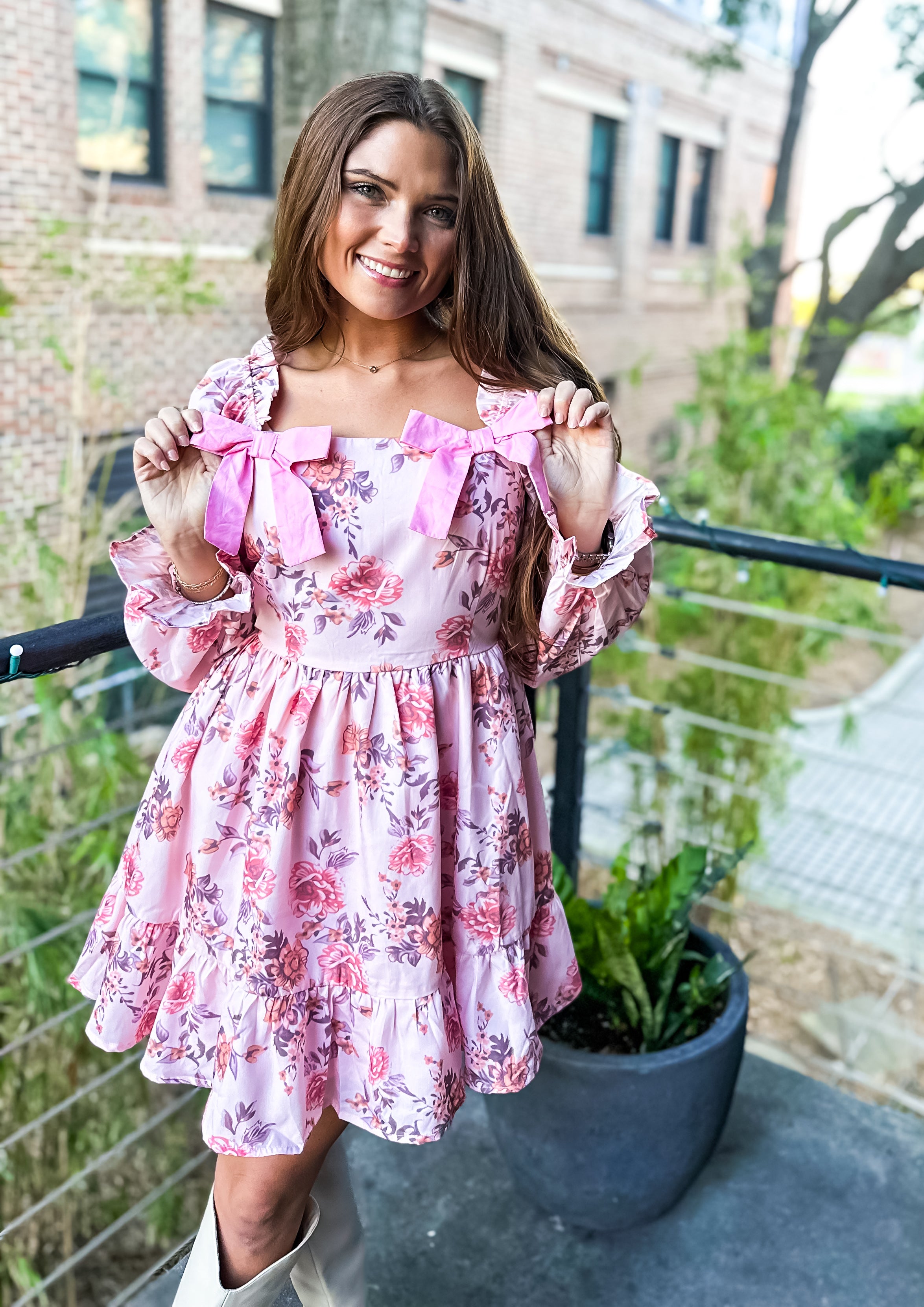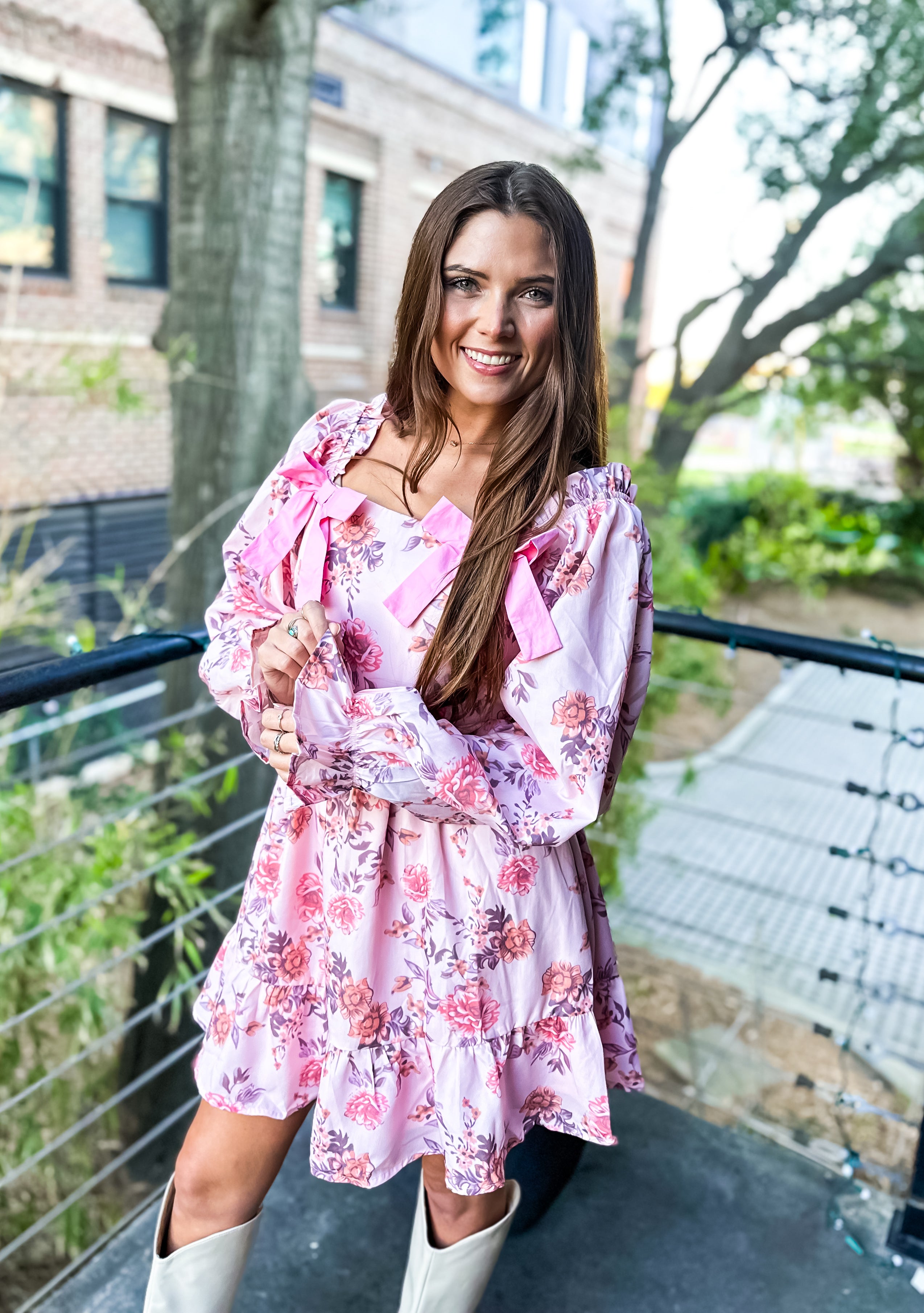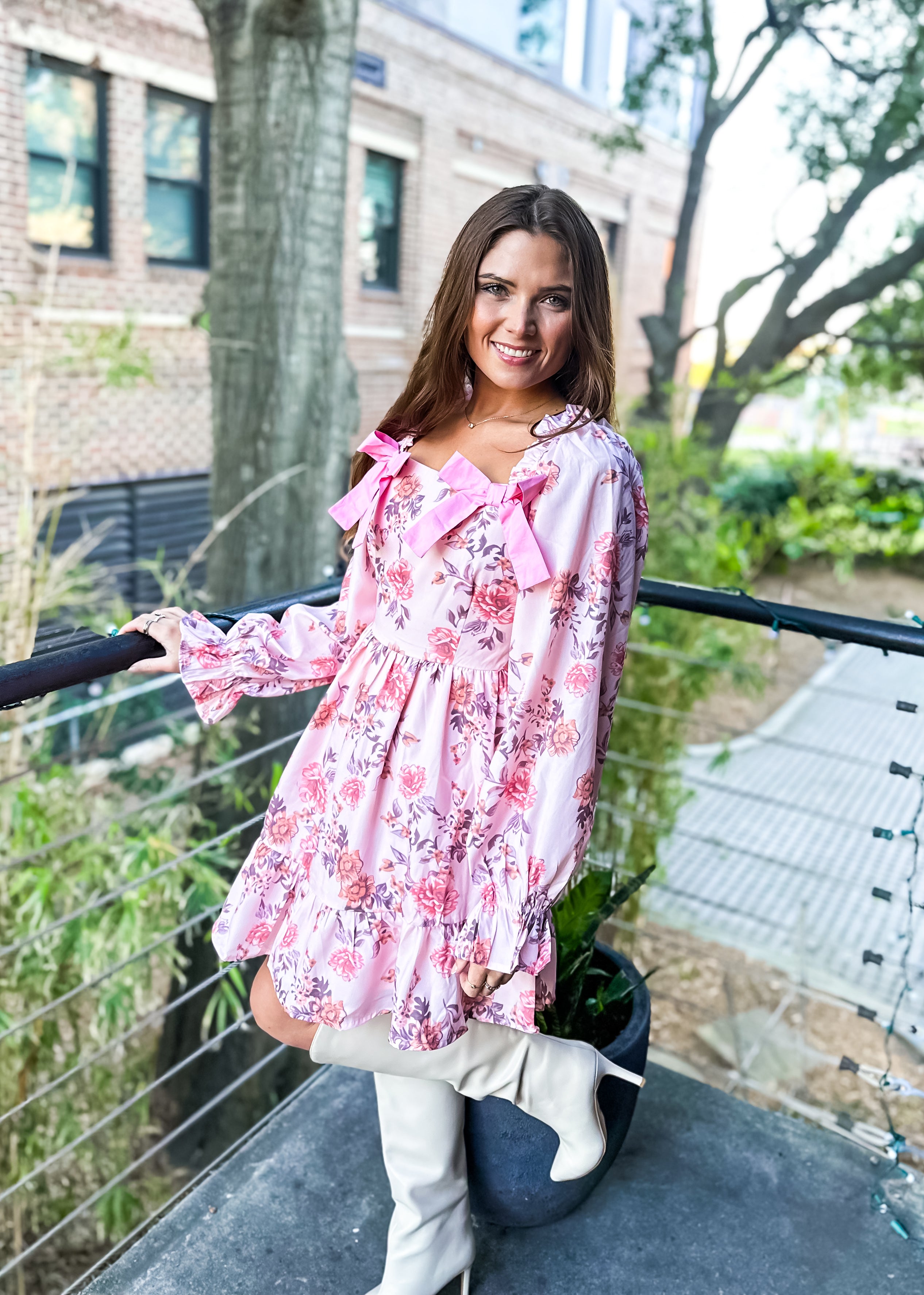 Long sleeve mini dress with ribbon bow details at the neckline of the dress. It features an elastic sleeve at the shoulder and around the neckline for extra comfort. It does feature a zipper down the center of the back of the dress for easy on and off. It does have smocking around the bust for extra comfort. It is lined as well - for extra coverage.