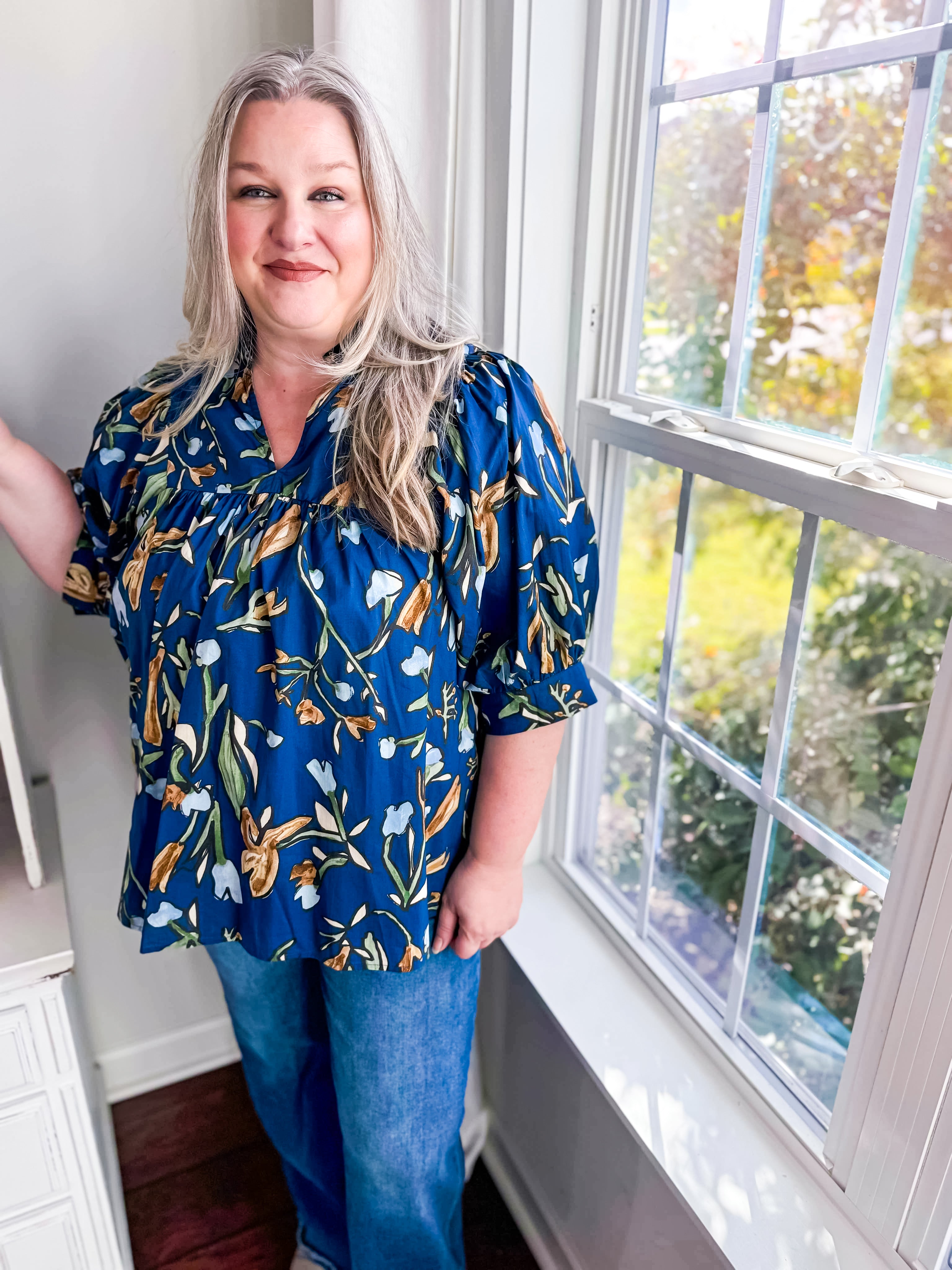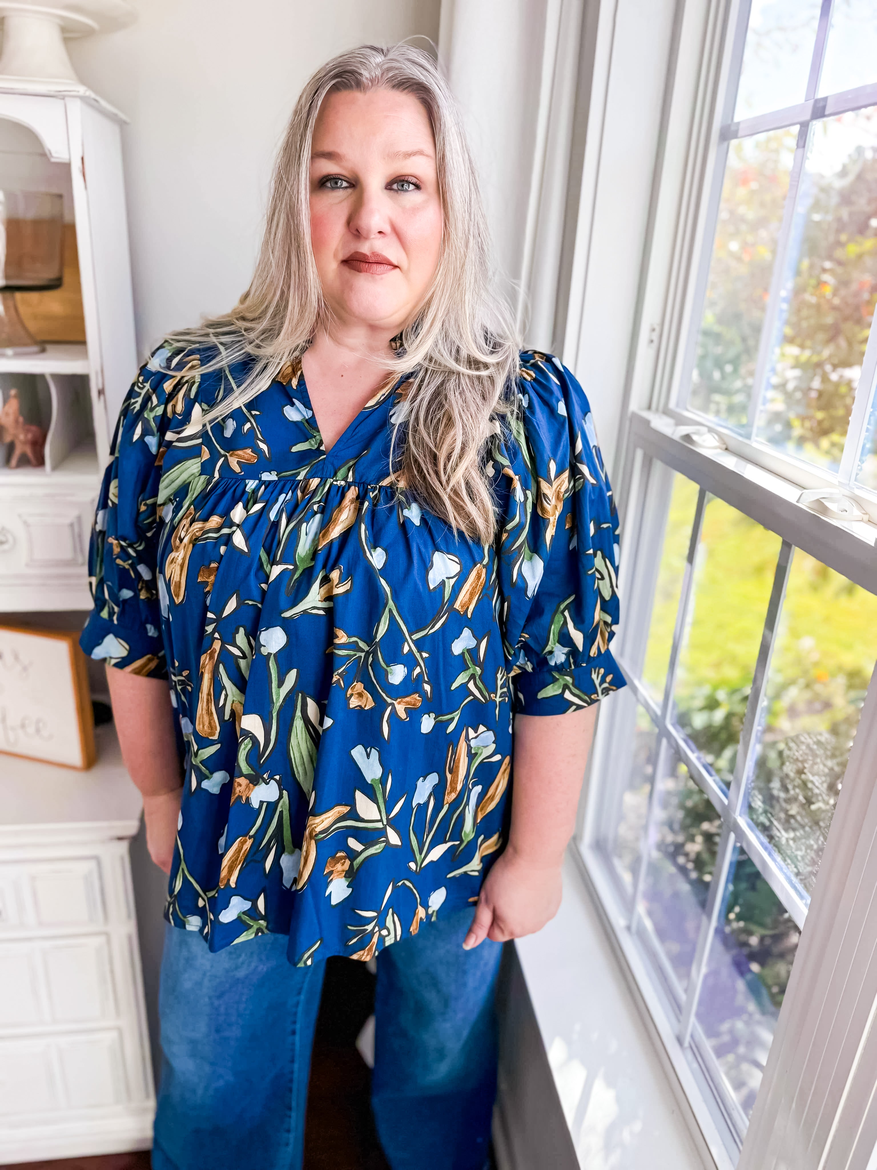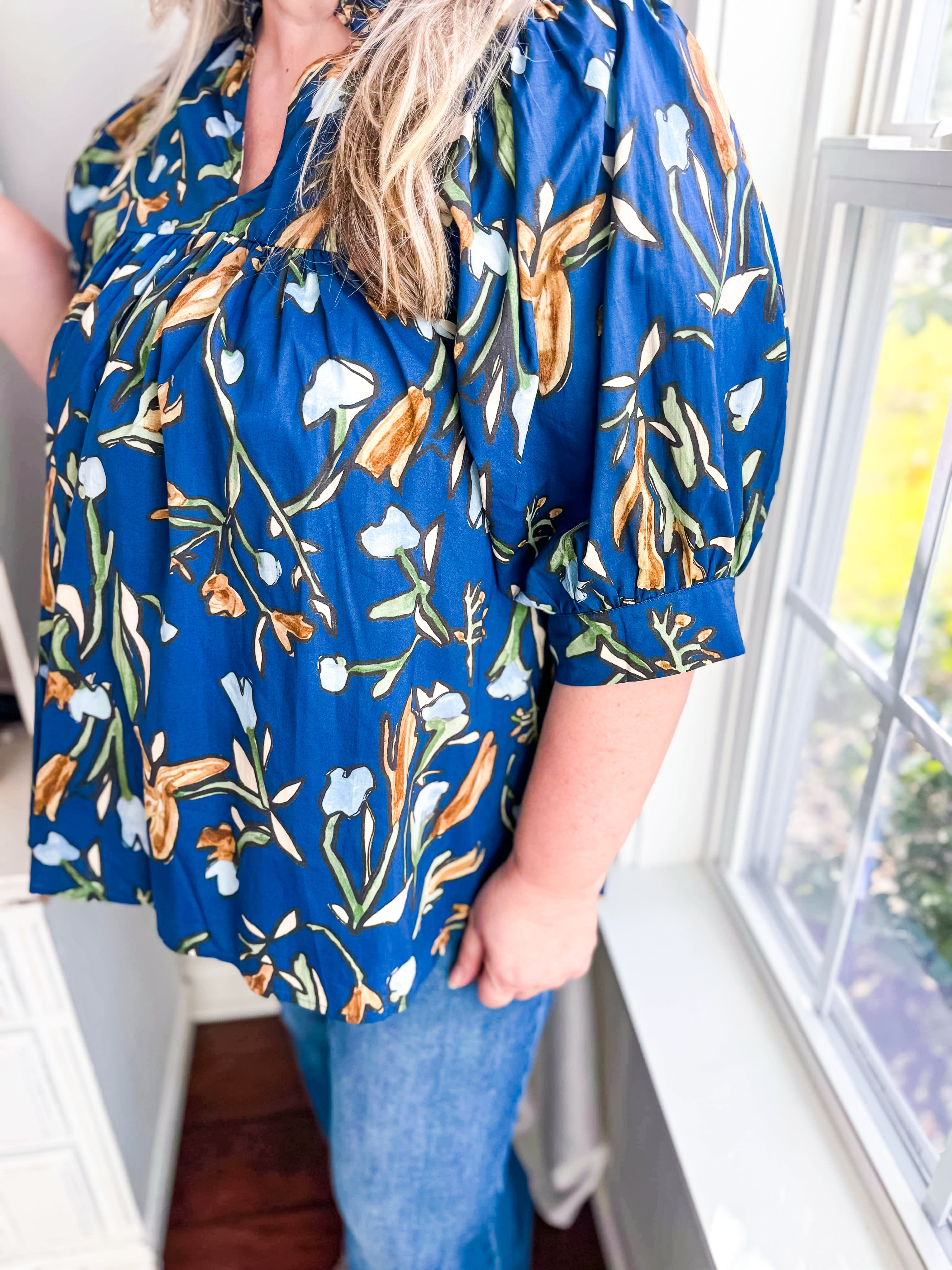 Floral print v-neck half sleeve top featuring ruffle detail at neckline. Button closure at cuff. Unlined. Woven. Non-sheer. Lightweight.