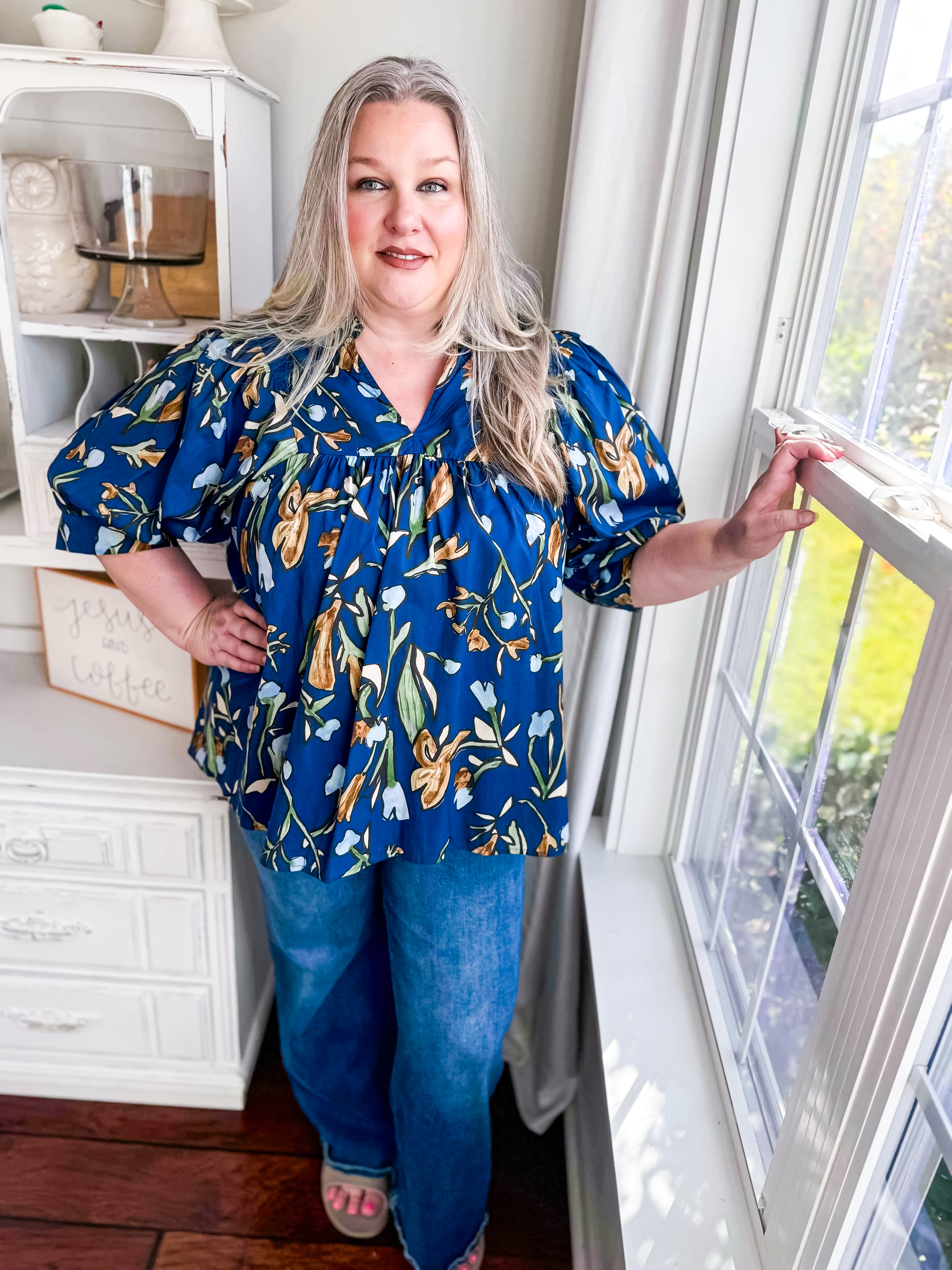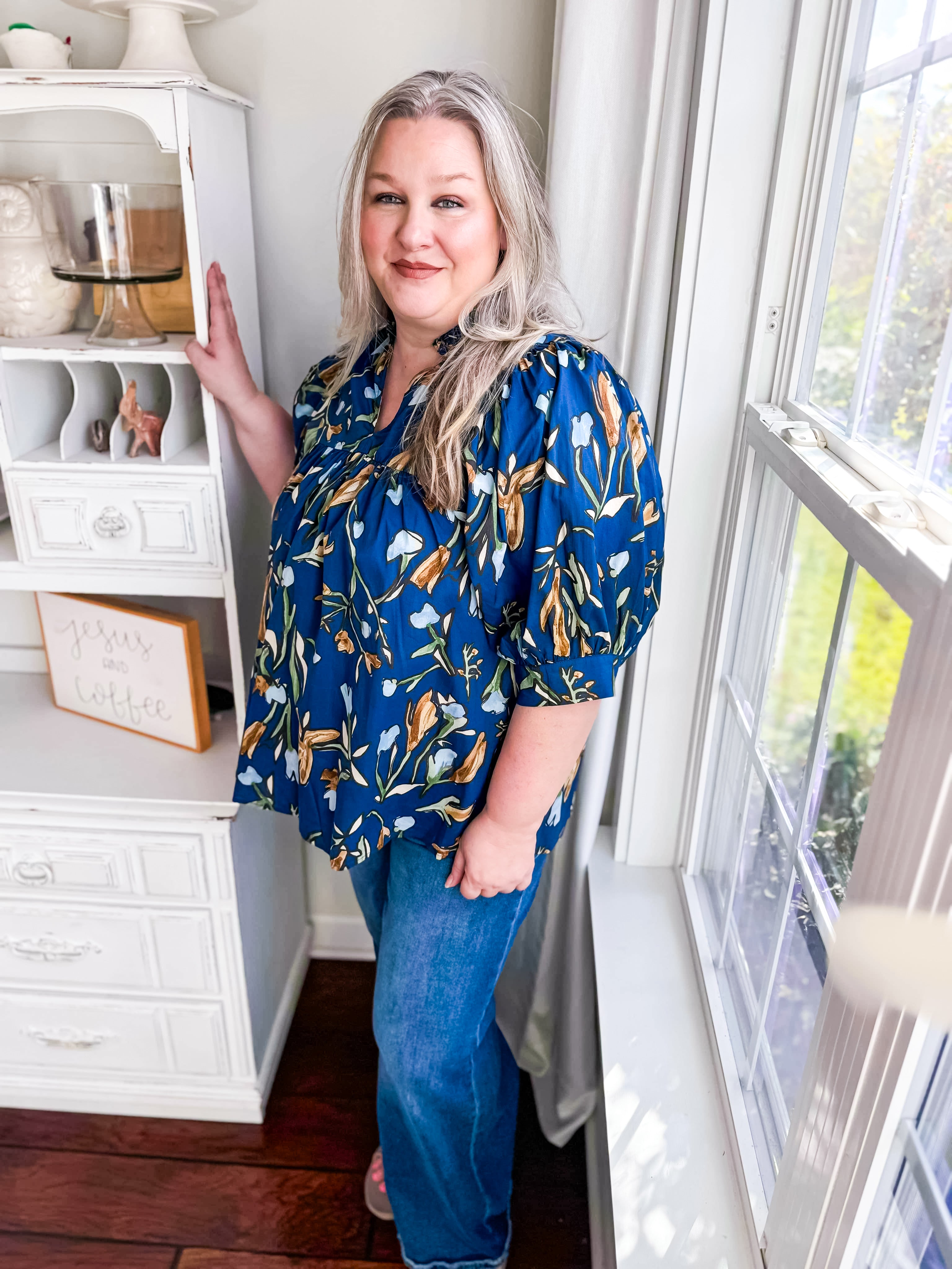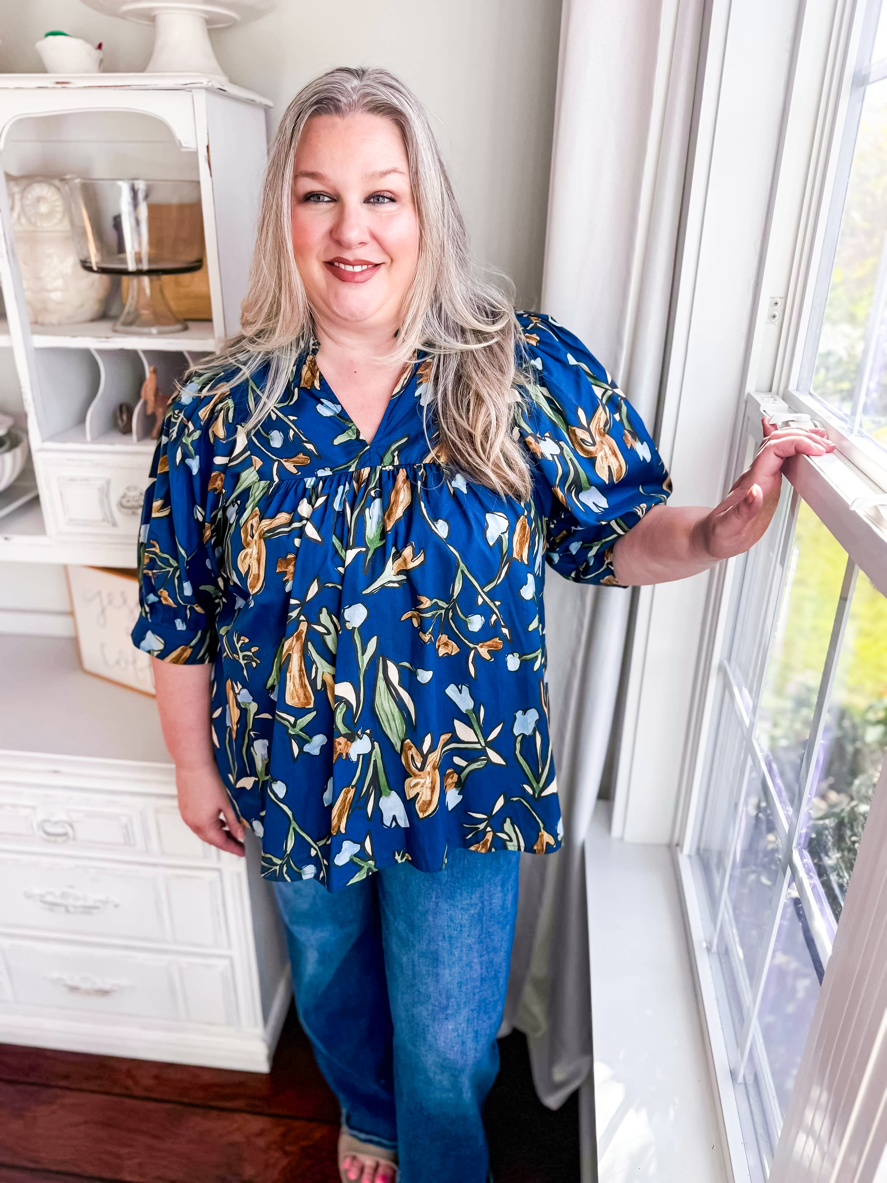 Floral print v-neck half sleeve top featuring ruffle detail at neckline. Button closure at cuff. Unlined. Woven. Non-sheer. Lightweight.