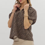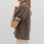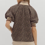 Leopard pattern short puff sleeve half-zip top featuring multicolor band collar. Unlined. Woven. Non-sheer. Lightweight.