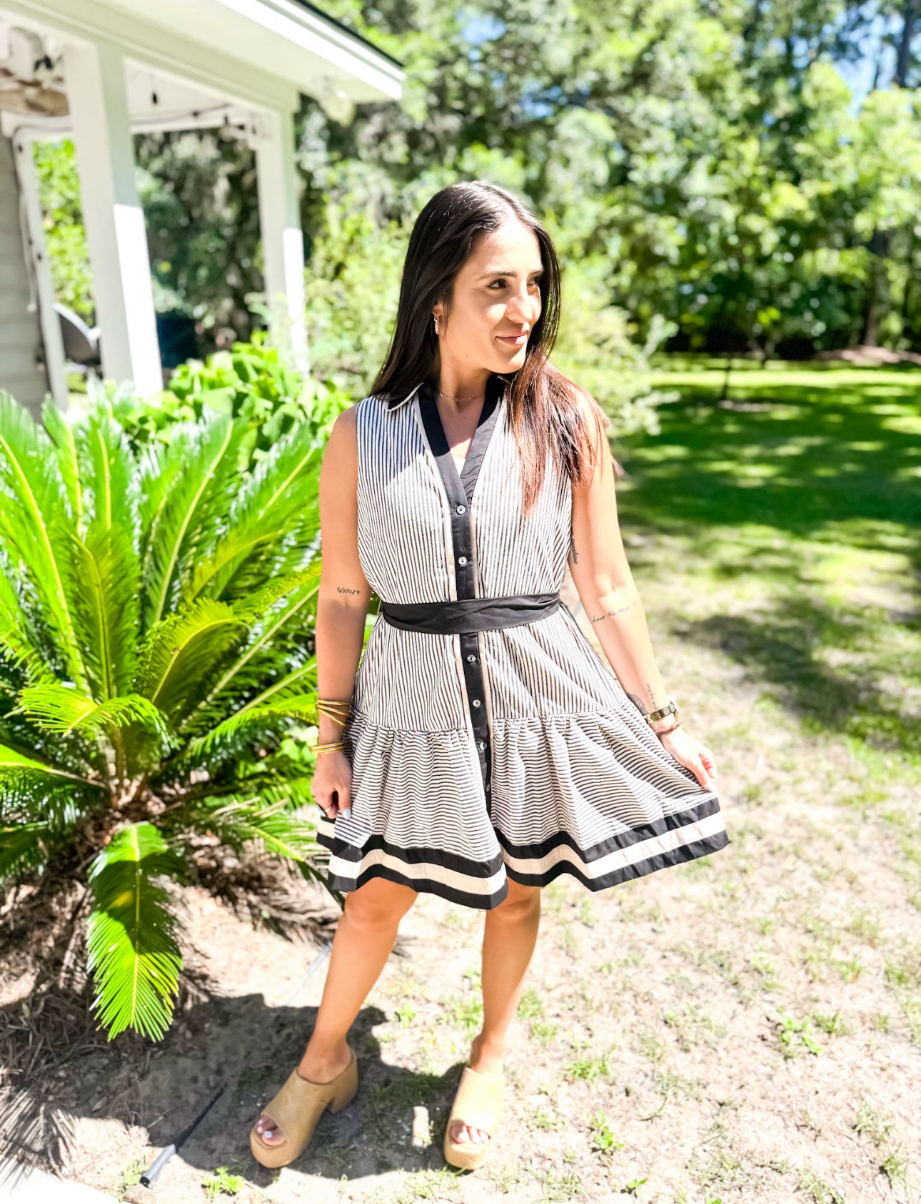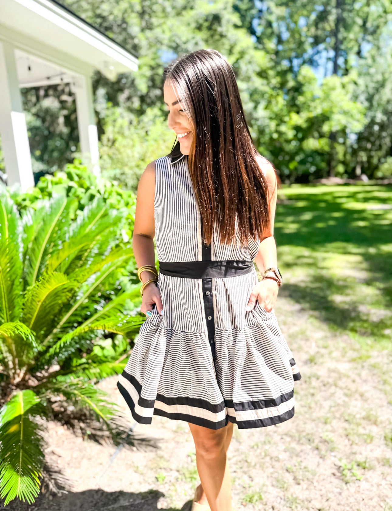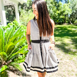 Stripe pattern ruffle hem sleeveless mini dress featuring multicolor band button closure placket and hem detail. Removable self-belt. Pockets at sides. Lined. Woven. Non-sheer. Lightweight.