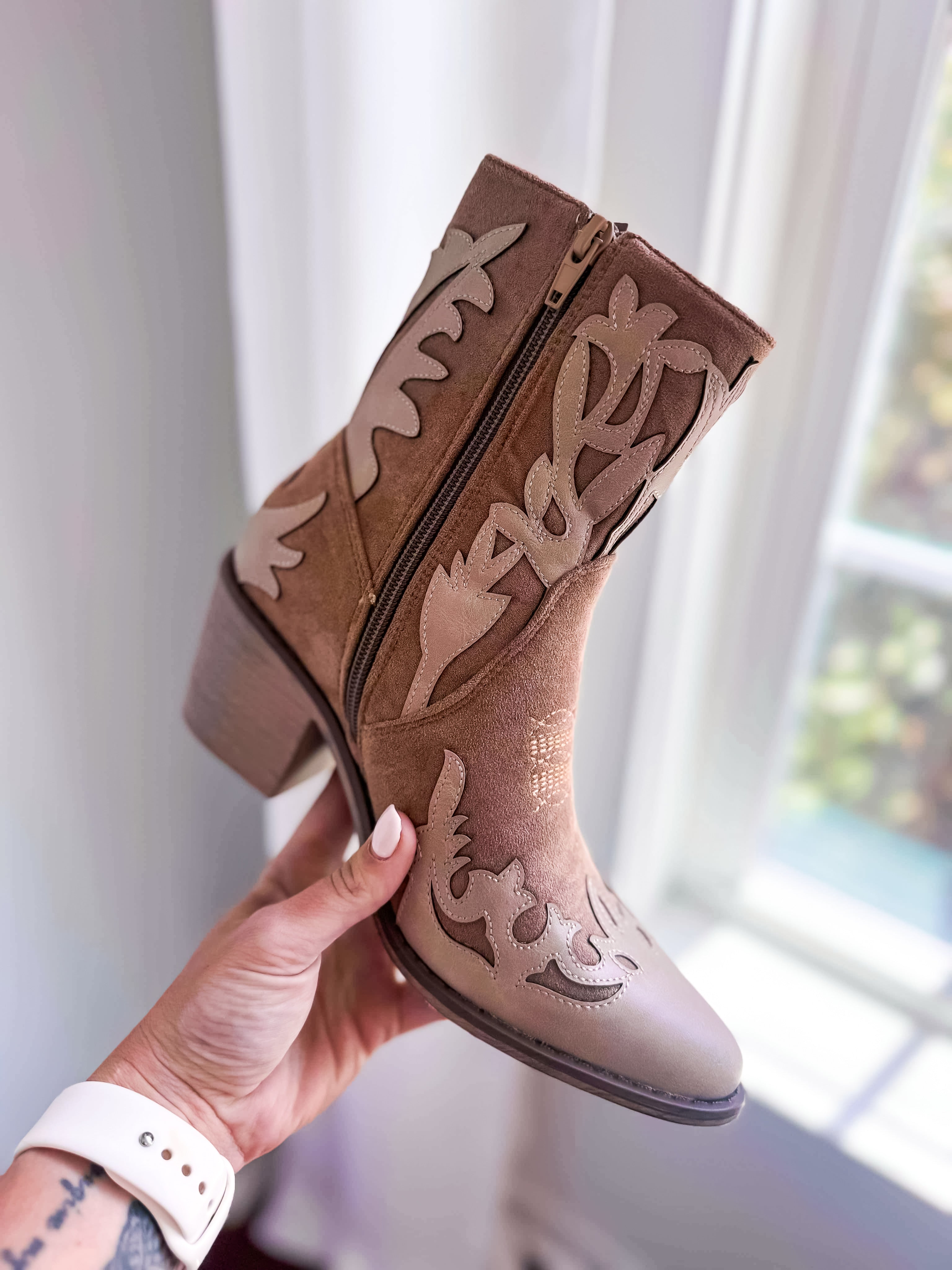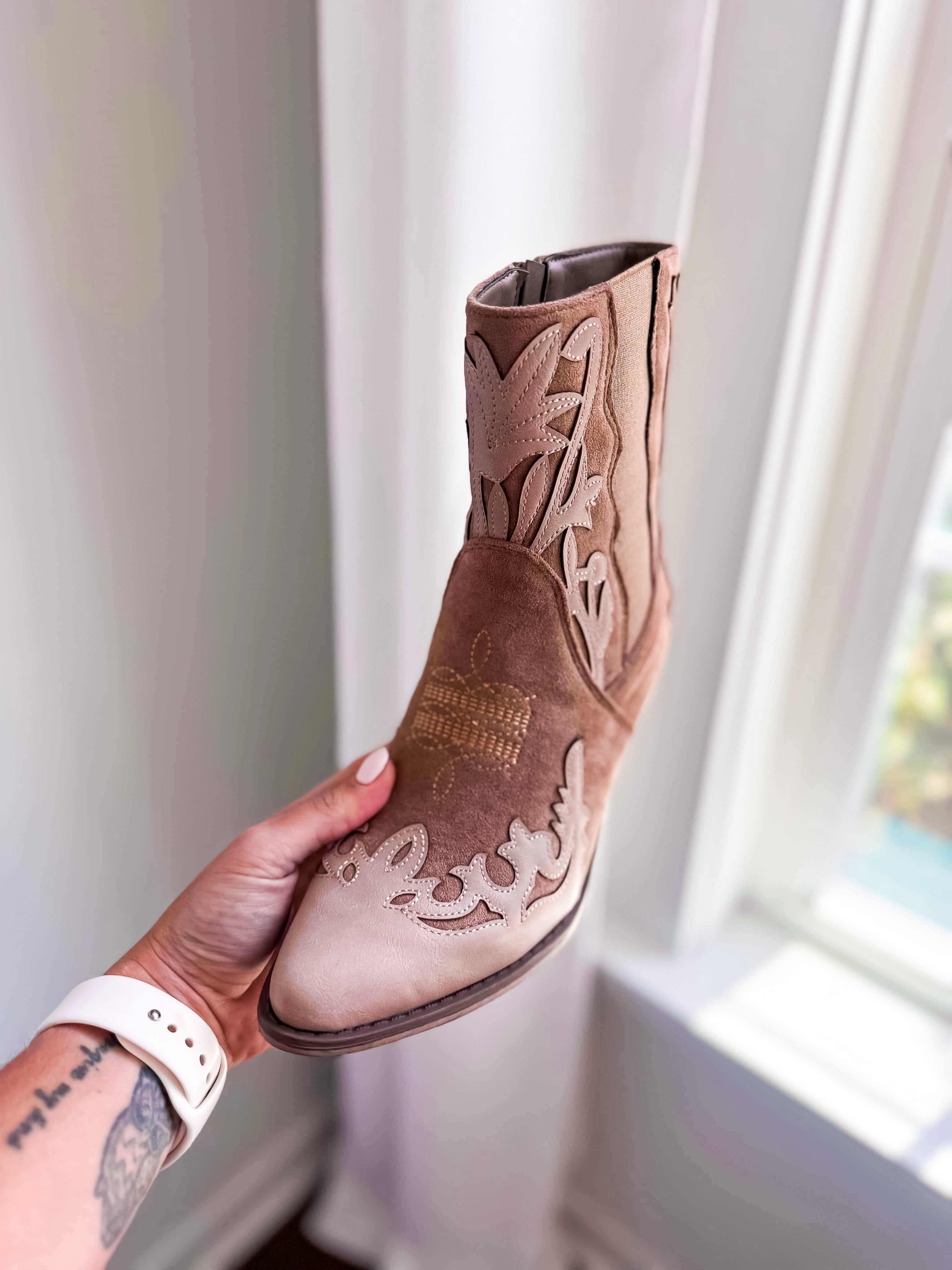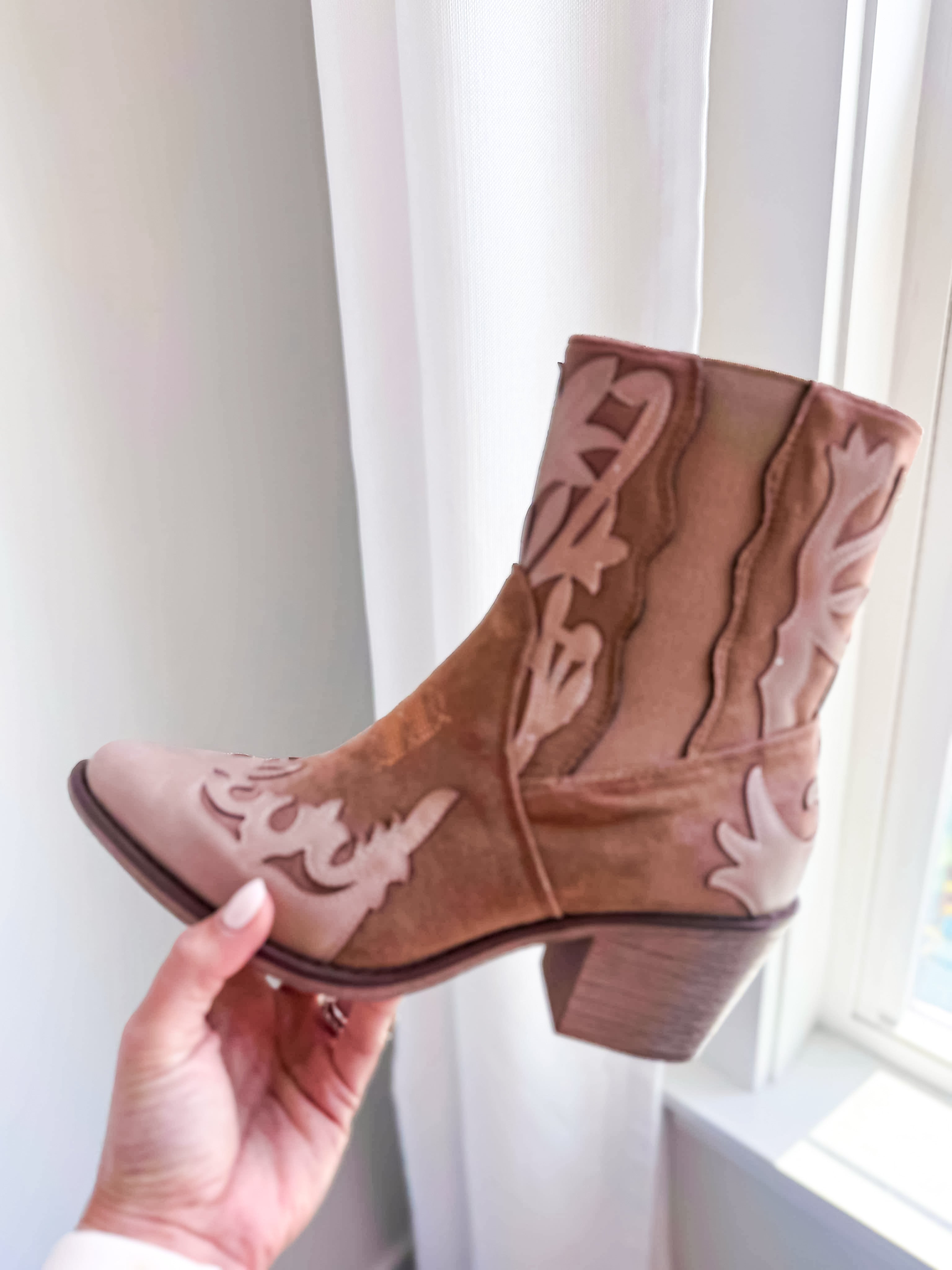 The best ankle boot around. It has a western kick to it. Light taupe base with a lighter heel. Great with denim or dresses.