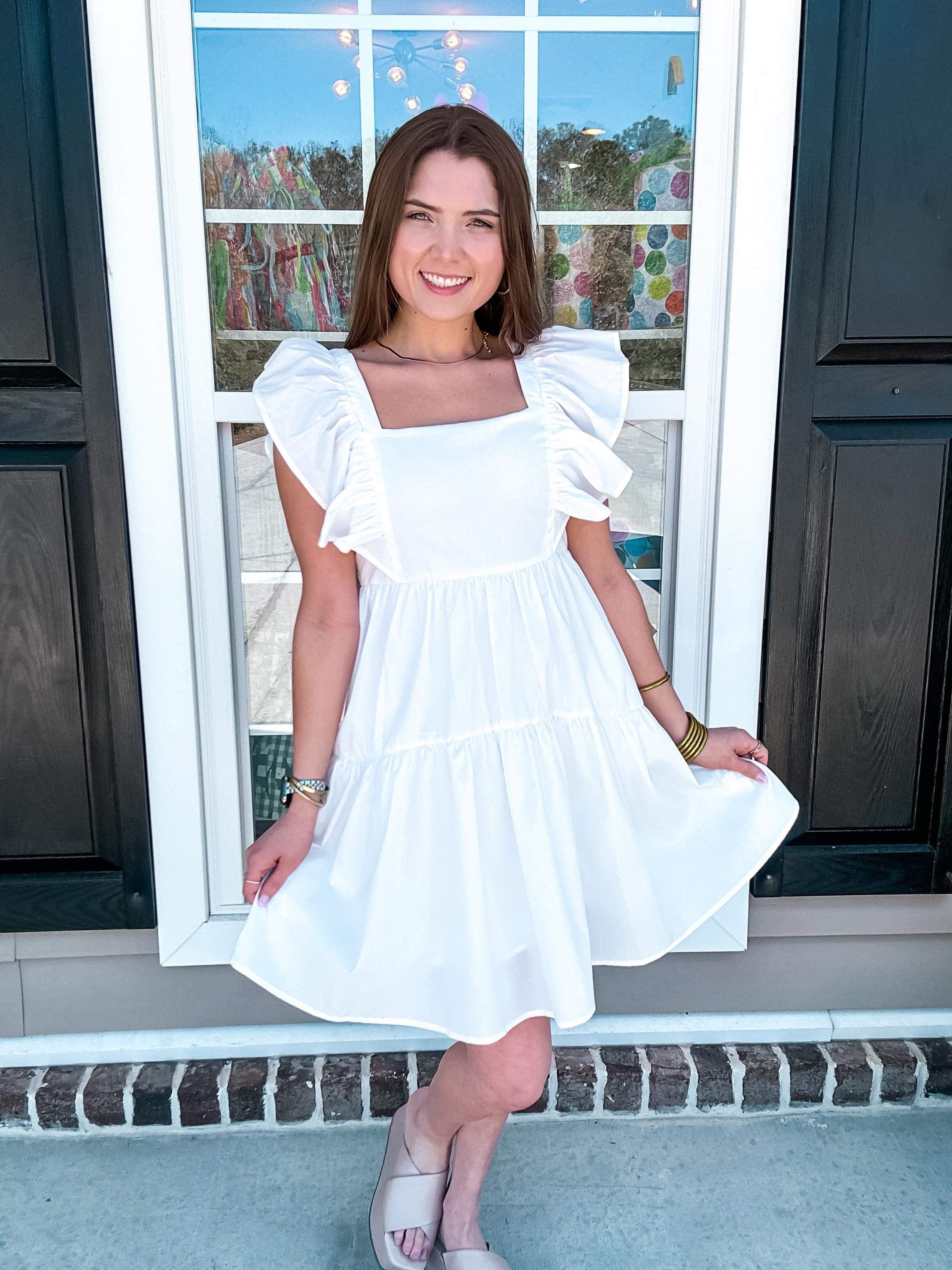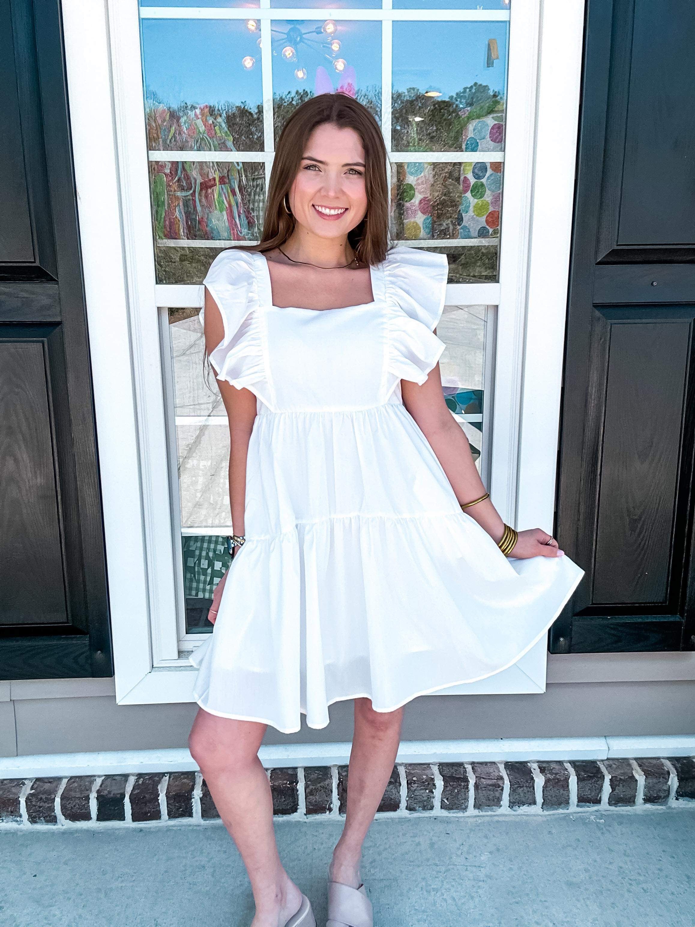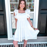Solid square neck baby doll dress featuring ruffle sleeves. Pockets at side. Lined. Woven. Non-sheer. Lightweight.