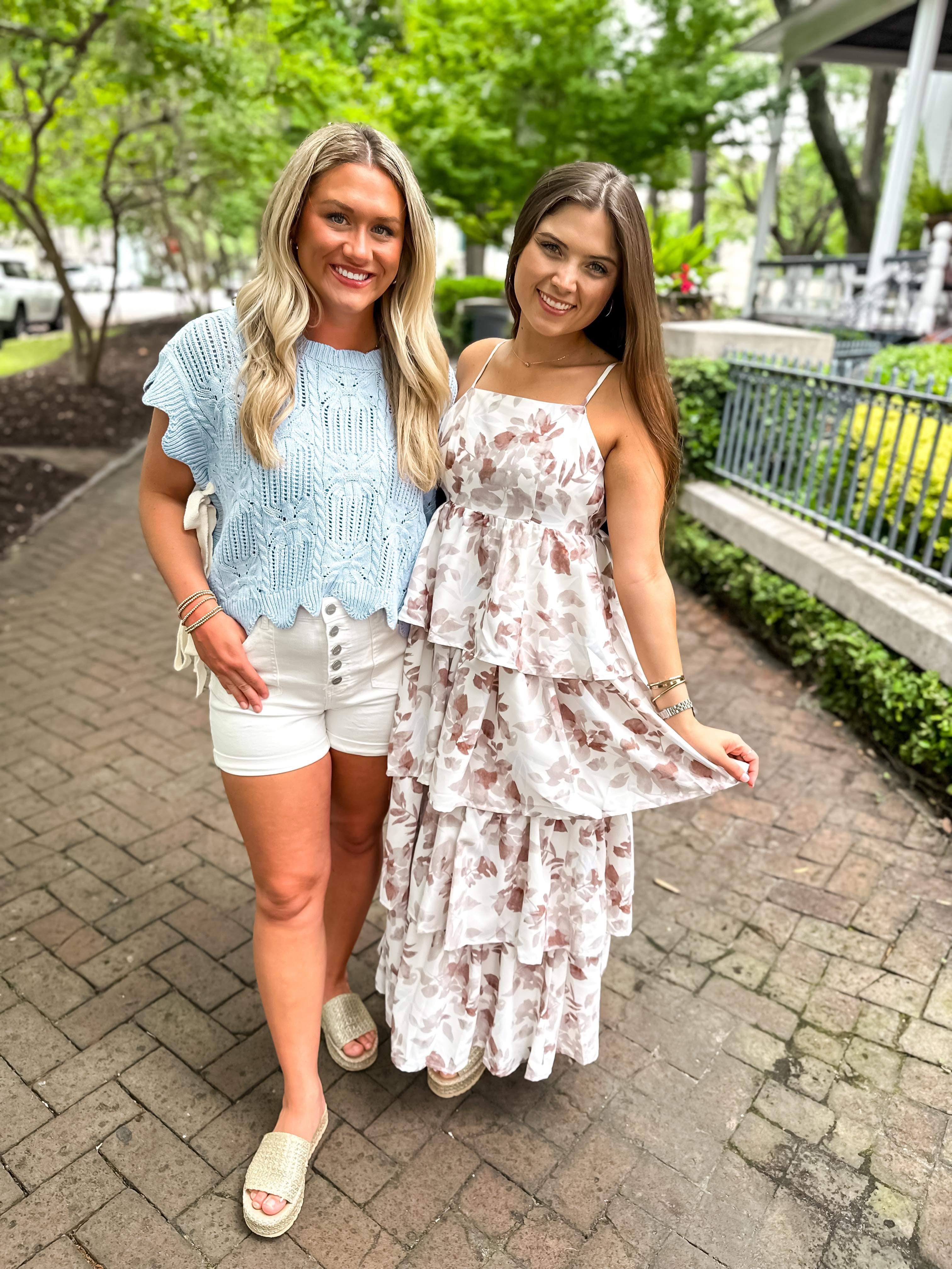 Crochet knit short sleeve crop top featuring scalloped hem. Self-tie bow detail at sides. Unlined. Knit. Non-sheer. Lightweight.