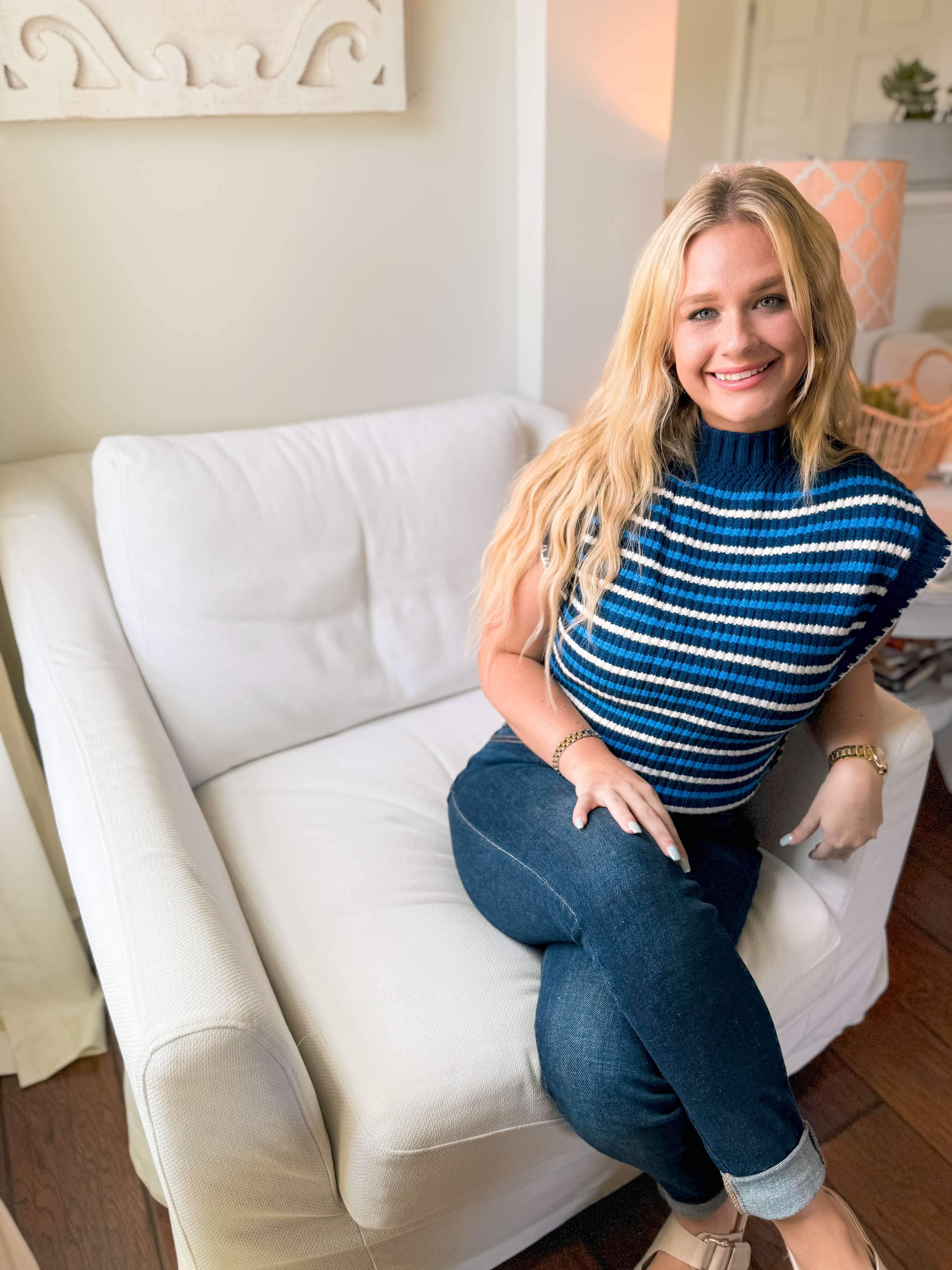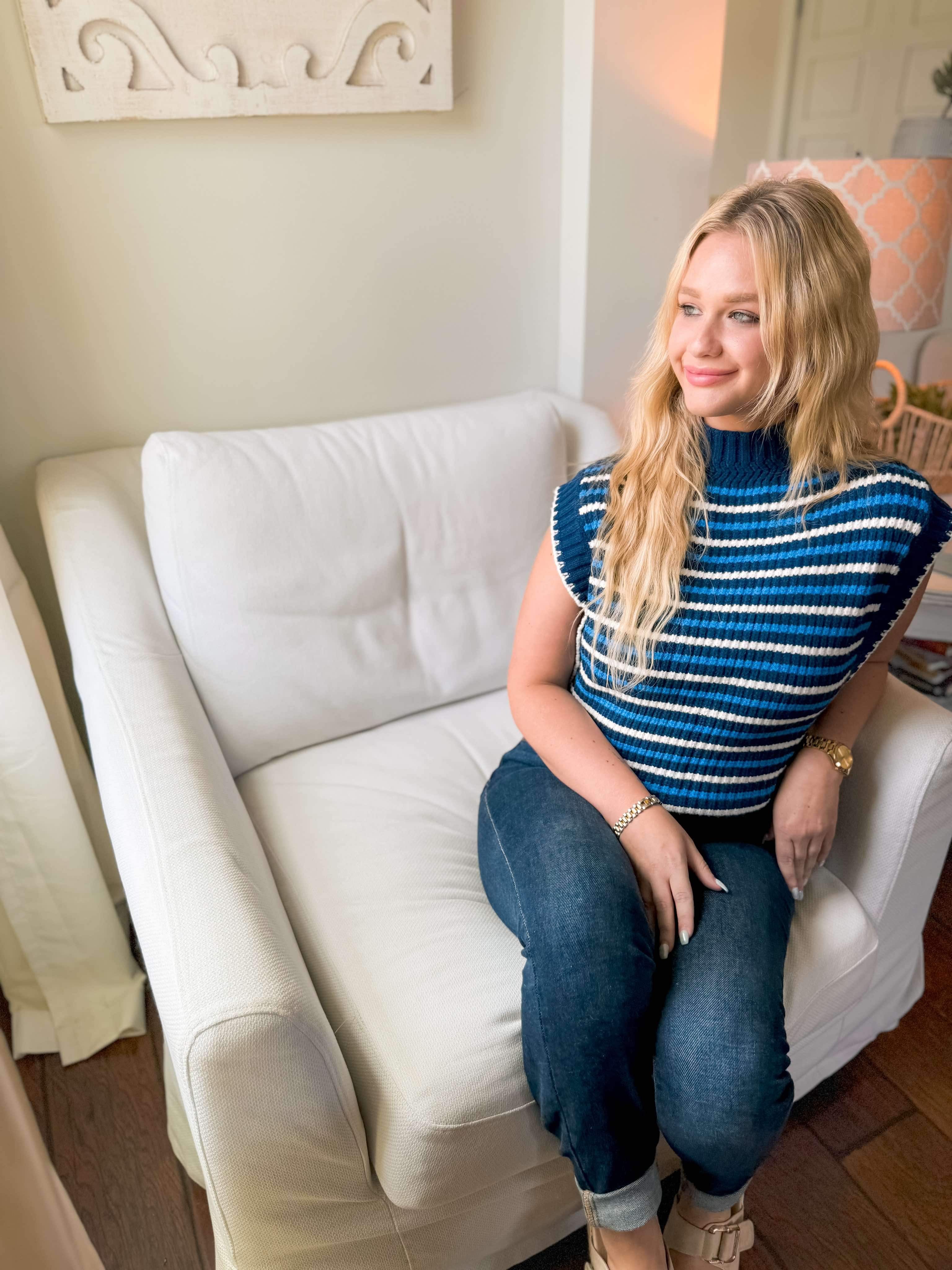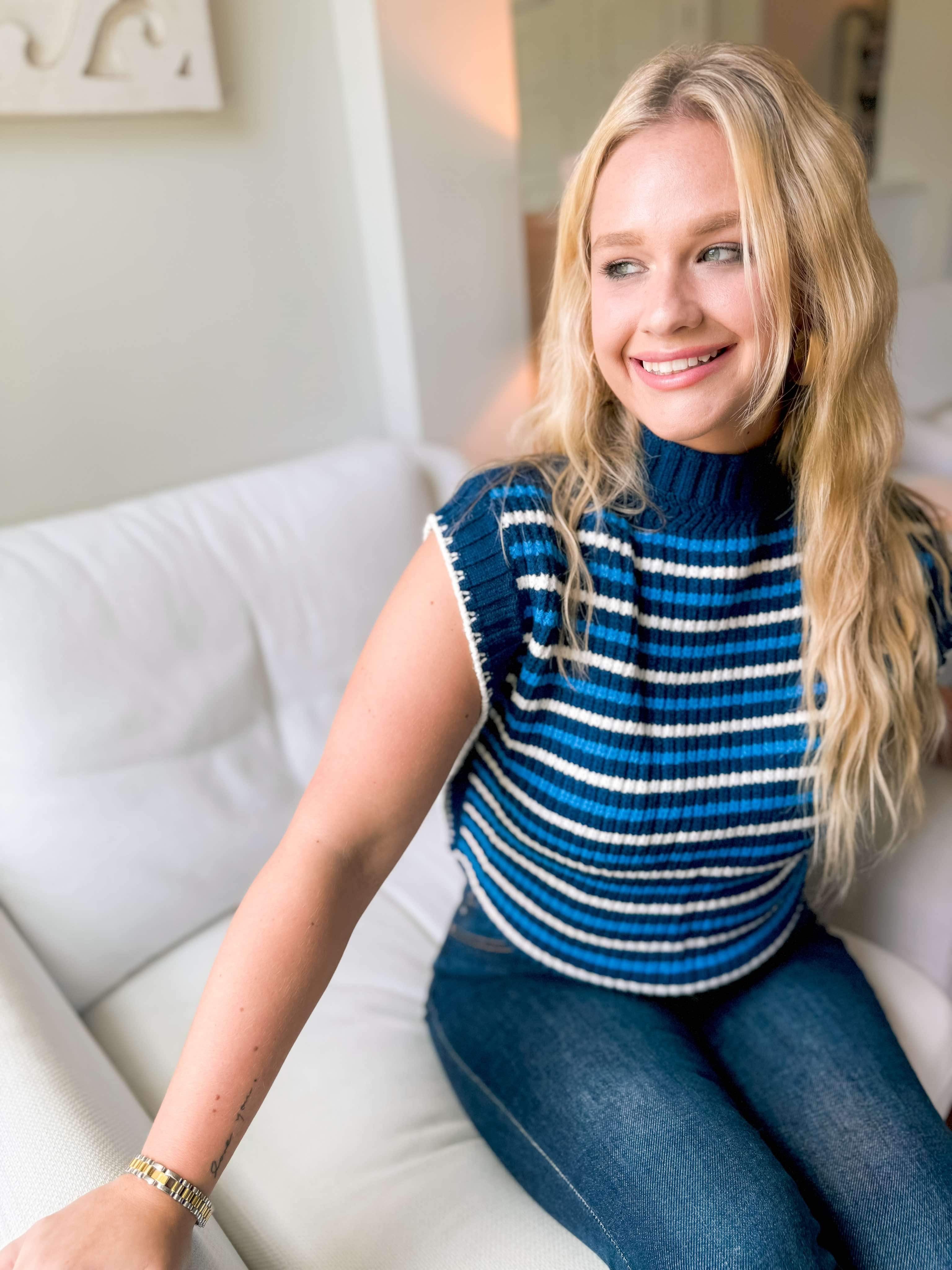 Introducing our You See It Sweater in Navy. It is a lightweight knitted material with a navy base and a lighter blur and cream stripes throughout. It is a small turtleneck that can easily fold to make it lower - if you are not into turtlenecks. It features a cap sleeve so they do not stick to you at all. Such a great piece for all year around! Pair her with any bottoms - especially white!