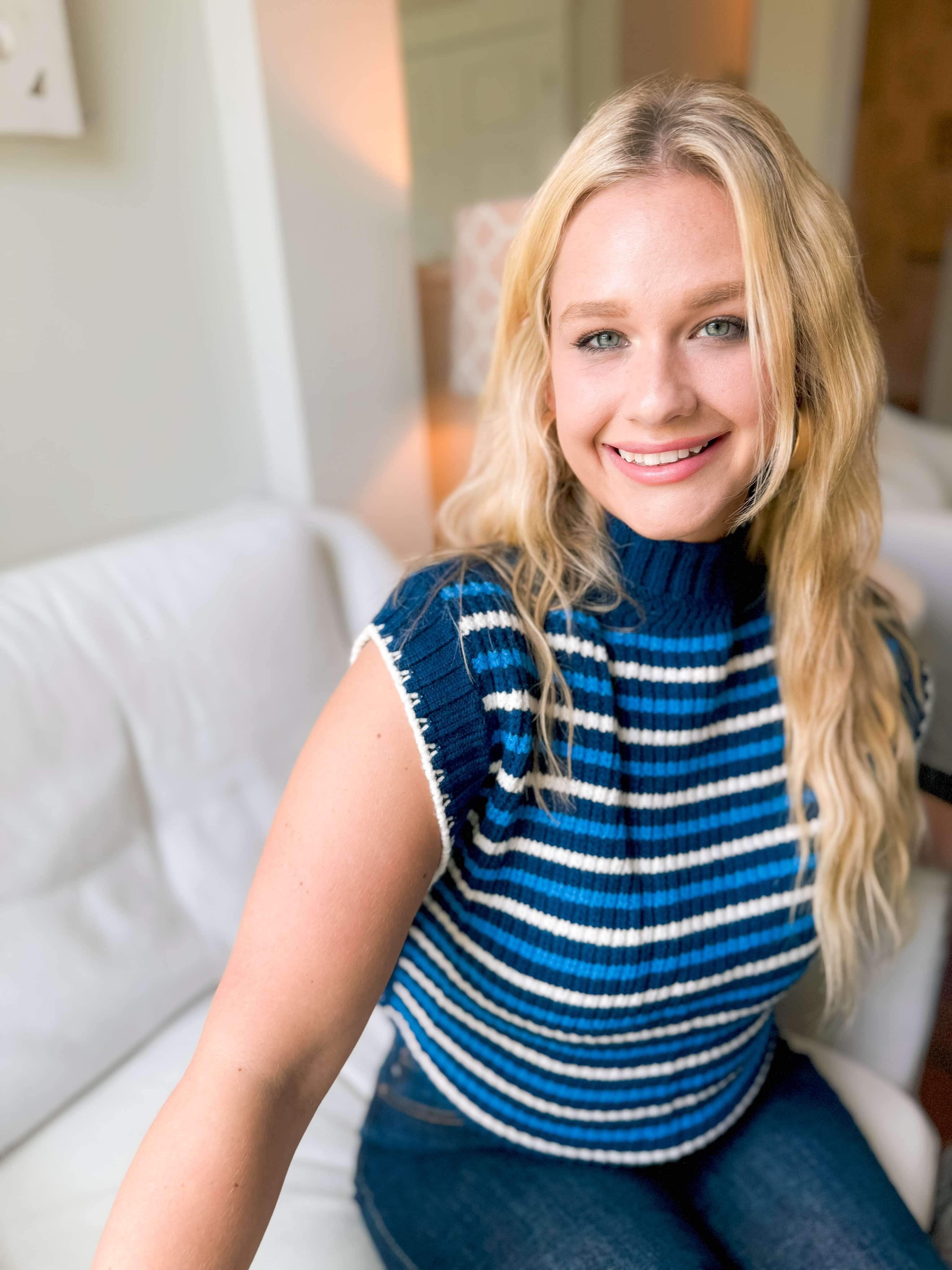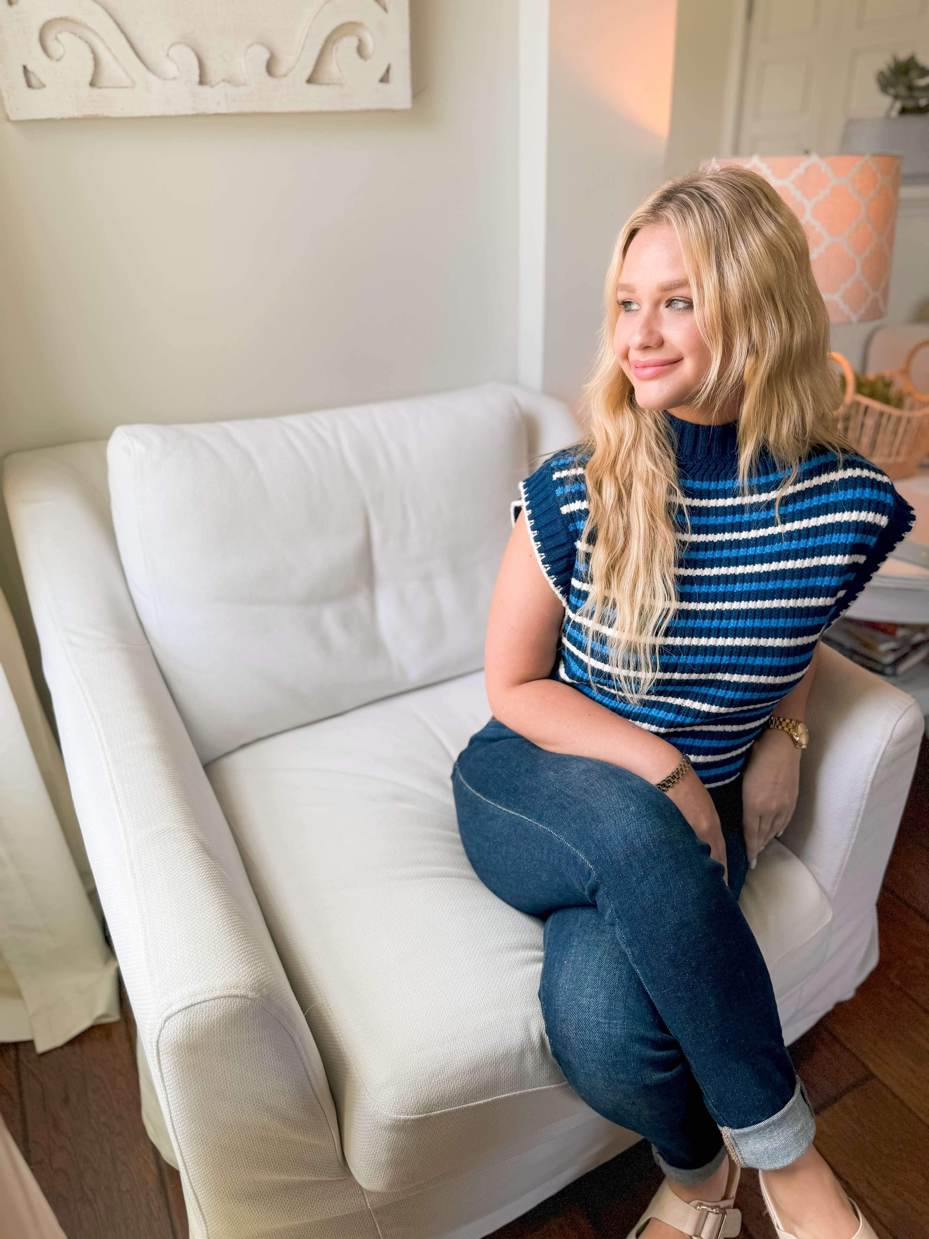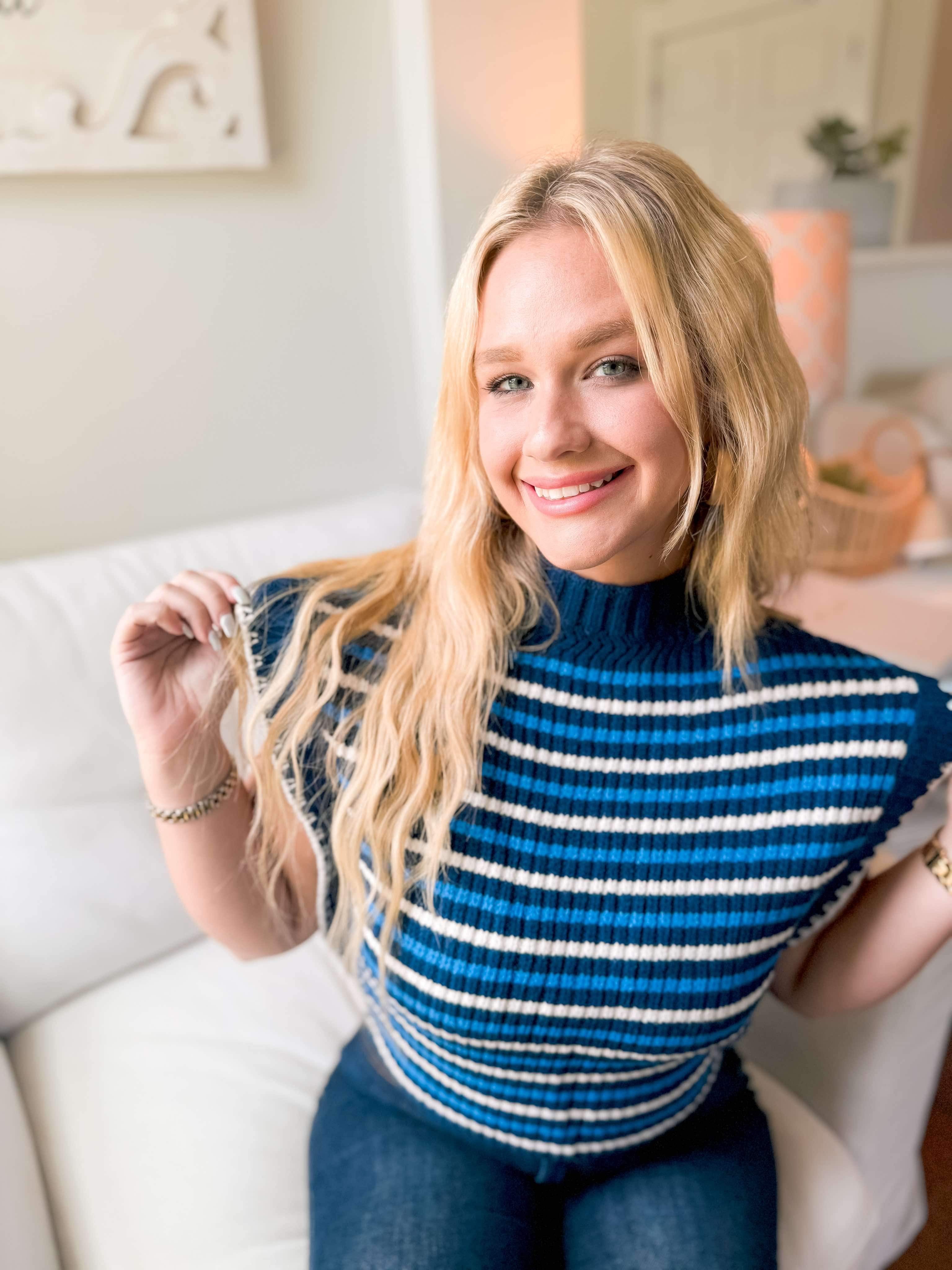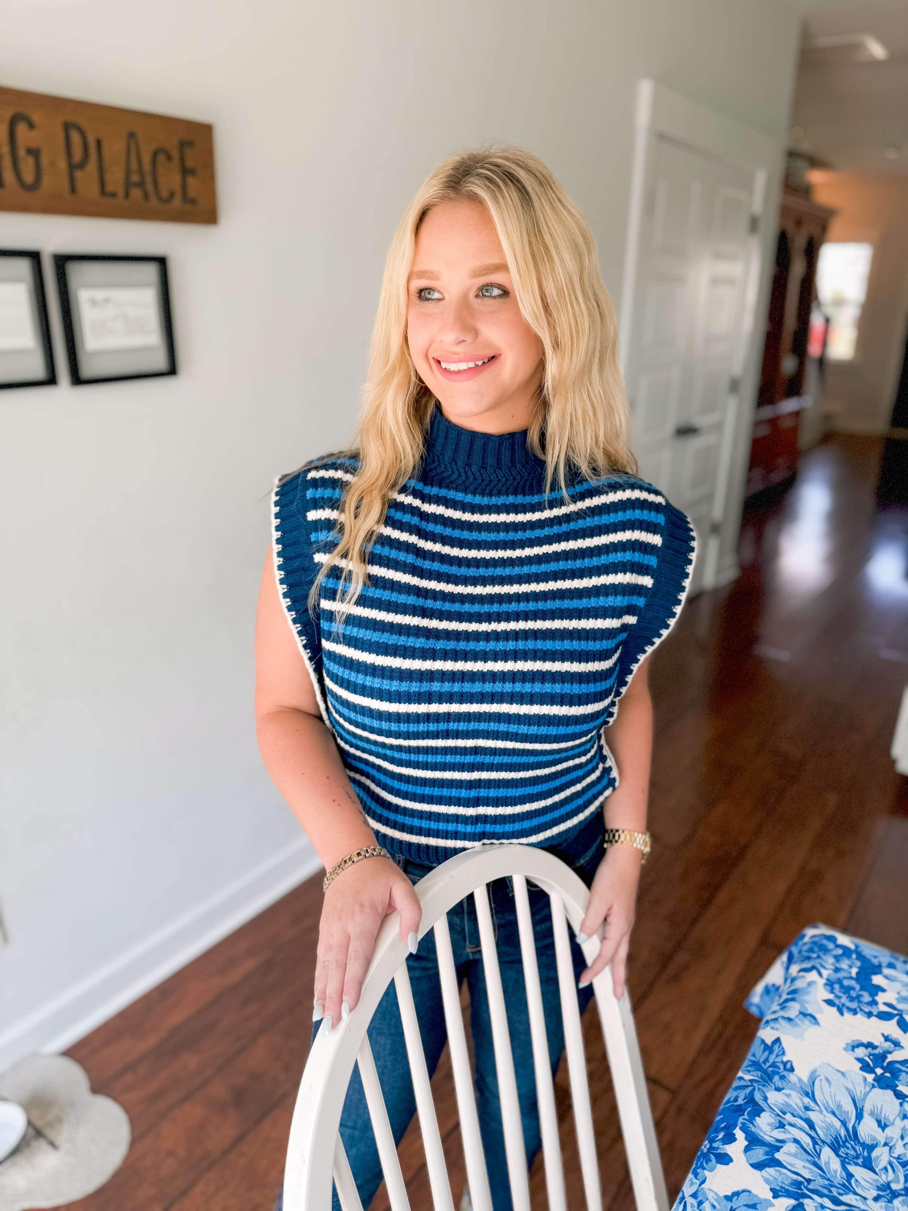 Introducing our You See It Sweater in Navy. It is a lightweight knitted material with a navy base and a lighter blur and cream stripes throughout. It is a small turtleneck that can easily fold to make it lower - if you are not into turtlenecks. It features a cap sleeve so they do not stick to you at all. Such a great piece for all year around! Pair her with any bottoms - especially white!